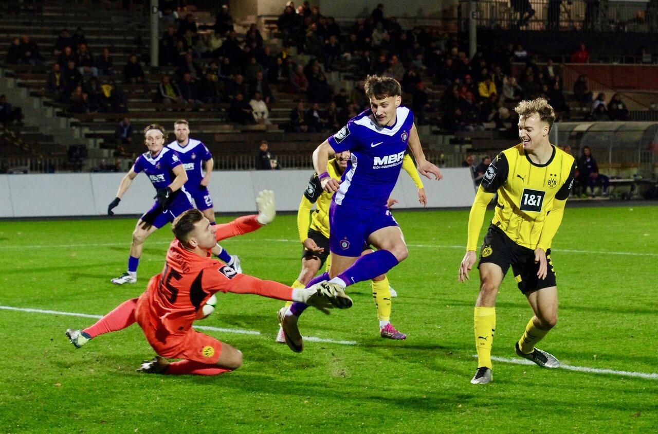 Kurz vor der Halbzeitpause kamen die Veilchen wieder gefährlich in den Dortmunder Strafraum und hatten gleich zwei Großchancen zum Ausgleich. In der 43. Minute bekam der BVB eine Auer Flanke nicht mehr aus der gefährlichen Zone geklärt. Der Ball sprang durch den Strafraum und Ali Loune legte das Leder per Kopf auf Kilian Jakob. Der Torschütze zum 1:0 versuchte es aus gut zehn Metern erneut per Volleyschuss und scheiterte an Abwehrspieler Yannik Lührs. Nur wenige Minuten später hatten die Veilchen gleich doppeltes Aluminium-Pech. Erst scheiterte Marvin Stefaniak mit einem Freistoß aus spitzem Winkel an der Querlatte und der anschließende Klärungsversuch eines Dortmunders prallte an den Pfosten. So ging es mit dem Rückstand in die Pause.