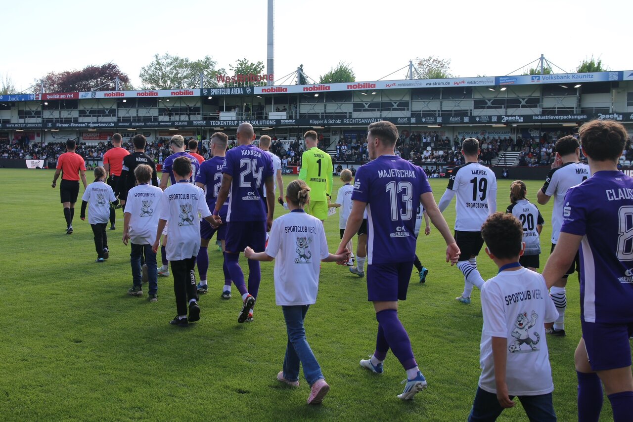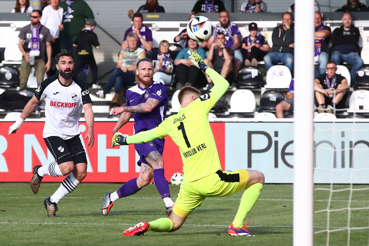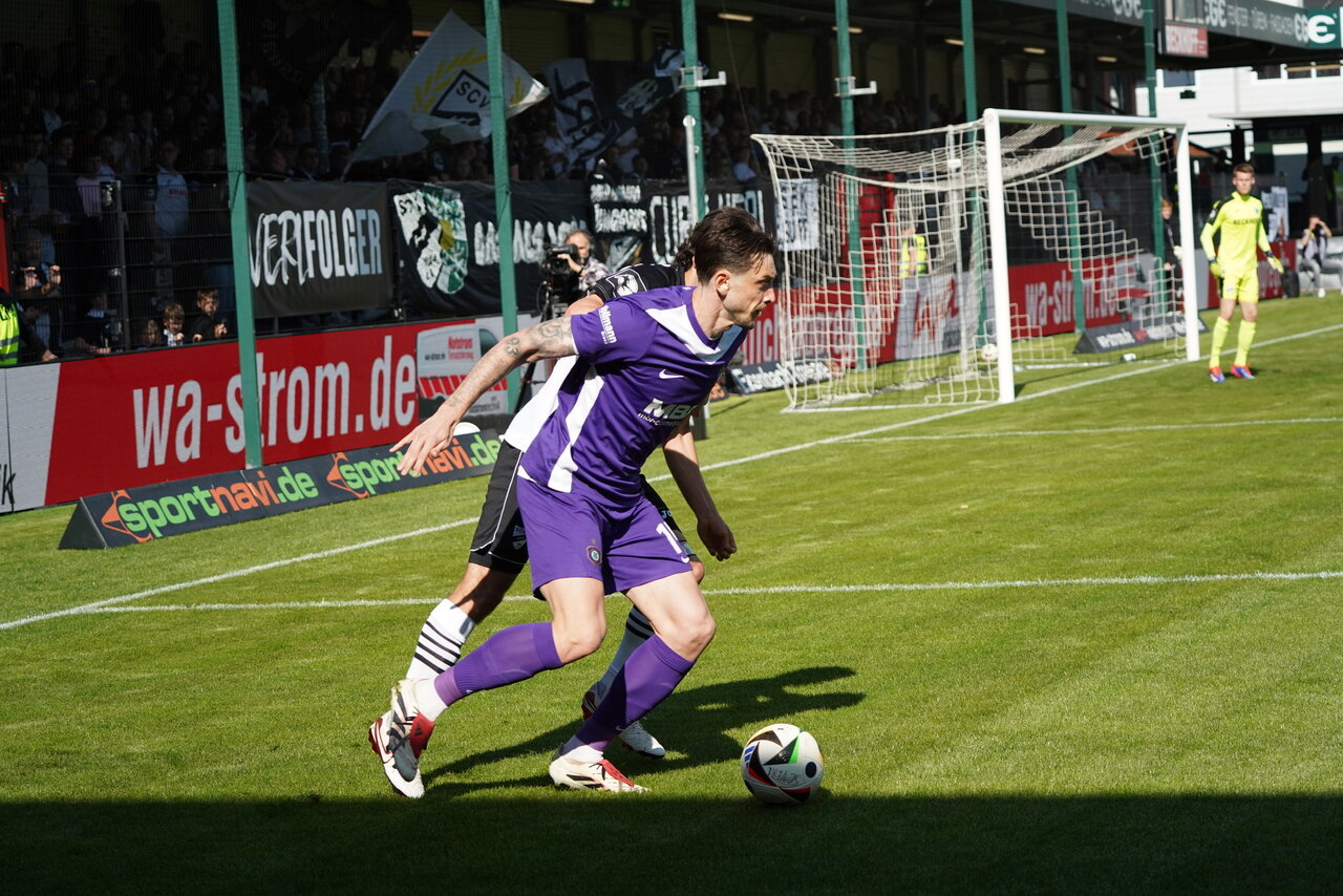 Nach dem hochverdienten Heimerfolg über die Zweitvertretung aus Dortmund reisten die Veilchen an diesem Wochenende selbst tief in den Westen und trafen in der Sportclub-Arena auf den Tabellenneunten Verl. Mit einem Sieg hätte die Elf von Cheftrainer Jens Härtel den Klassenerhalt de facto sicher machen können und der Übungsleiter der Lila-Weißen setzte auf die Startformation, die am Ostersonntag den BVB bezwang. Nur der gesperrte Jonah Fabisch fehlte im Auer Aufgebot und wurde durch Marvin Stefaniak ersetzt. Bei frühlingshaften Temperaturen und sonnigem Wetter ging es in Ostwestfalen ins Spiel. Die Lila-Weißen begannen mutig und hatten nach gut fünf Minuten die erste gefährliche Torchance. Ein Freistoß von der rechten Seite segelte durch den Strafraum, am langen Pfosten verpassten die Auer die Einschusschance.