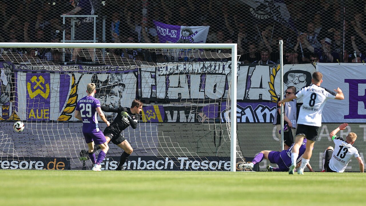 Das einzige Lebenszeichen der Auer Offensive gab es in der 70. Minute. Nach einem perfekten Pass in die Spitze setzte sich Marvin Stefaniak im Laufduell durch und zog im Strafraum ab. Der erste ernstzunehmende Abschluss der Veilchen schlug direkt im Dreiangel ein und die Lila-Weißen verkürzten auf 1:4. Ein starker Pass und ein strammer Schuss brachten Aue endlich auf die Anzeigetafel. Es konnte so einfach sein, aber direkt im Anschluss brachten sich die Erzgebirger selbst um diesen kleinen Erfolg. Wieder zog Verl das Tempo an und kombinierte sich vor das Tor von Martin Männel. Linksverteidiger Niko Kijewski brachte den Ball von links flach ins Zentrum und mit seiner Rettungstat grätschte Anthony Barylla das Spielgerät in den eigenen Kasten. 5:1 für Verl - eine dicke Packung für die Veilchen, die in der Schlussphase die letzte Chance hatten. Nach einer Grätsche von Daniel Mikic an Pascal Fallmann im Strafraum zeigte der Unparteiische Yannick Rupert auf den Elfmeterpunkt und sprach Aue einen Strafstoß zu. Sean Seitz schnappte sich die Kugel, aber passend zum Tag ahnte Schlussmann Philipp Schulze die Ecke und kratzte das Leder von der Linie. Damit blieb es beim 1:5 aus Sicht der Auer, die in Ostwestfalen eine auch in der Höhe verdiente Niederlage kassieren.