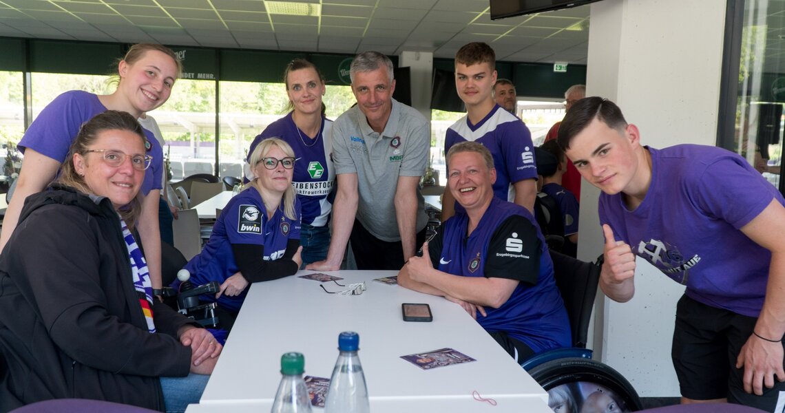 Unter dem Motto „Inklusiv im Spiel – Fans mit Handicap im Mittelpunkt“ veranstaltete der FC Erzgebirge Aue am Dienstagabend einmal mehr ein Fantreffen der besonderen Art. Etwa 100 Veilchen-Anhänger waren der Einladung gefolgt und freuten sich vor allem über die Begegnung mit der Profimannschaft.