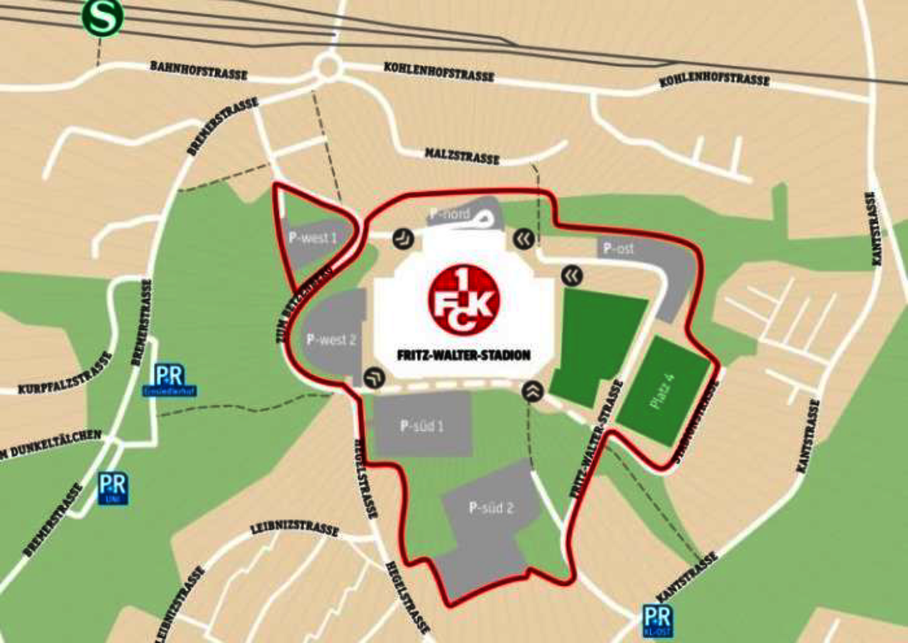 www.teufelscard.de Promillegrenze Eine festgelegte Promillegrenze ab welcher der Zutritt ins Fritz-Walter-Stadion verwehrt wird, existiert nicht. Fans die am Eingang Ausfallerscheinungen zeigen, kann der Zutritt verwehrt werden. Geltungsbereich von Stadionverboten Den folgenden Bereich um das Stadion dürfen mit einem Stadionverbot belegte Fans nicht betreten. Im Stadionumfeld gibt es keine Gaststätten oder Kneipen, in welchen Spiele übertragen werden oder sich mit Stadionverbot belegte Fans aufhalten können. In Einzelfällen behält es sich die Polizei vor, Personen die mit einem Stadionverbot belegt sind, innerhalb des Geltungsbereichs zu dulden (z.B. Anreise im Fanbus, der von der Polizei in diesen Bereich geleitet wird).