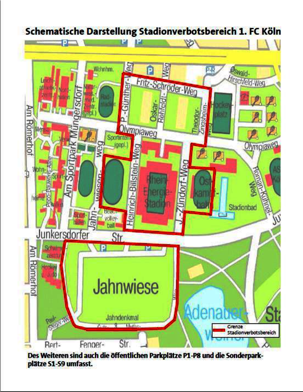 - Stadionverbote gelten für das Stadion und den gesamten Bereich der Platz- und Hallenanlage (rote Markierungen). Personen, gegen die ein bundesweites Stadionverbot ausgesprochen wurde, ist es untersagt, sich während Veranstaltungen des 1. FC Köln in diesem Gebiet aufzuhalten.