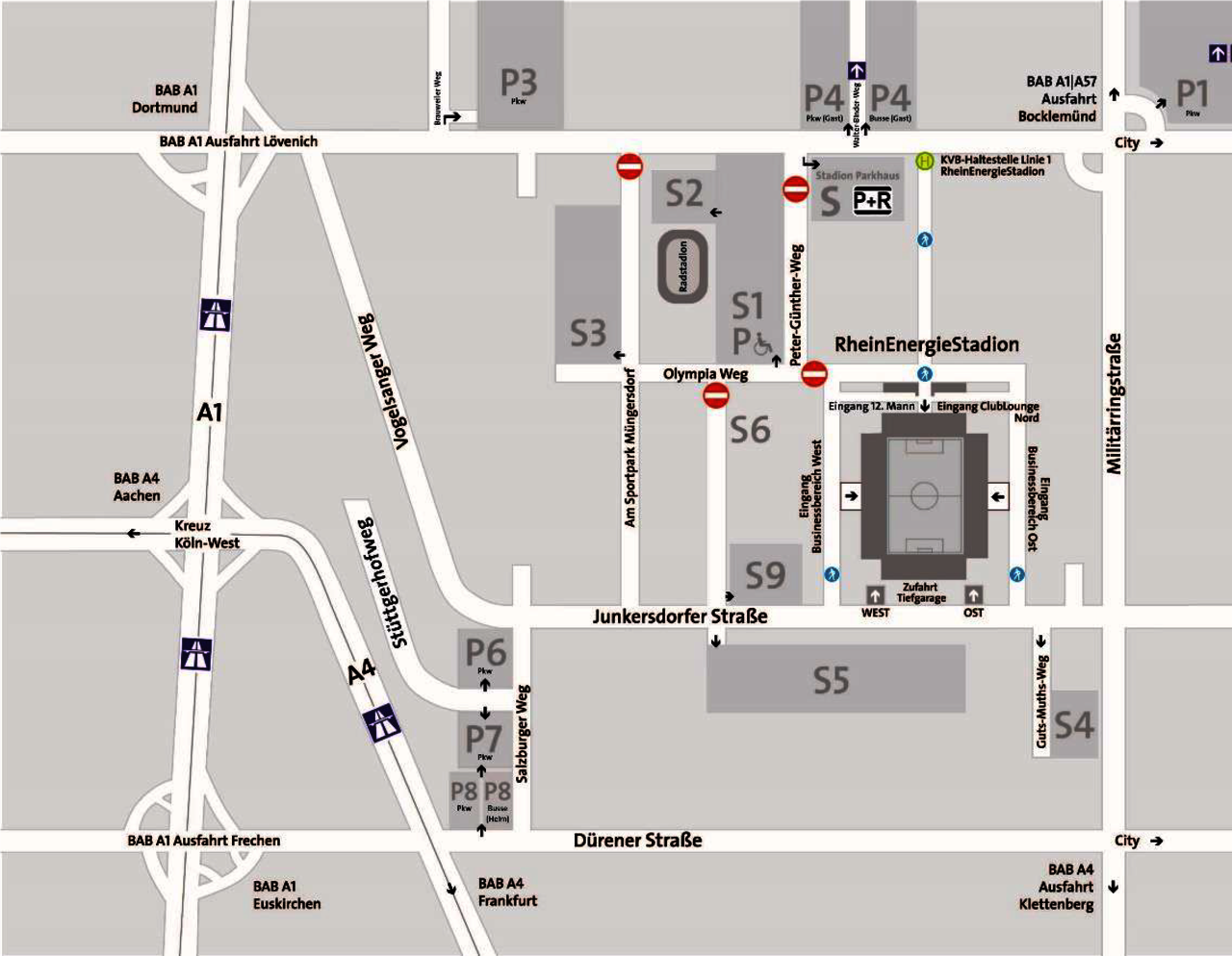 - Für Busse und Autos eurer Fans steht der Parkplatz P4 zur Verfügung. o Adresse fürs Navi: Aachener Str. 800, 50933 Köln o Bitte unbedingt über die Ausfahrt „103, Köln-Lövenich“ fahren. o Zur Vermeidung von Konflikten unter den Fangruppen bitte nicht die ausgeschilderten Busparkplätze P6-P8 für Heimfans im Süden anfahren! o Änderungen sind möglich! Kommunikation erfolgt dann von Polizei/Ordnungsdienst vor Ort. o Gebühren: Auto 7,- Euro, Transporter/Neunsitzer 14 Euro, Bus 20,- Euro o Das Laufenlassen von Motoren ist verboten und wird von der Stadt Köln mit einem Ordnungsgeld belegt.