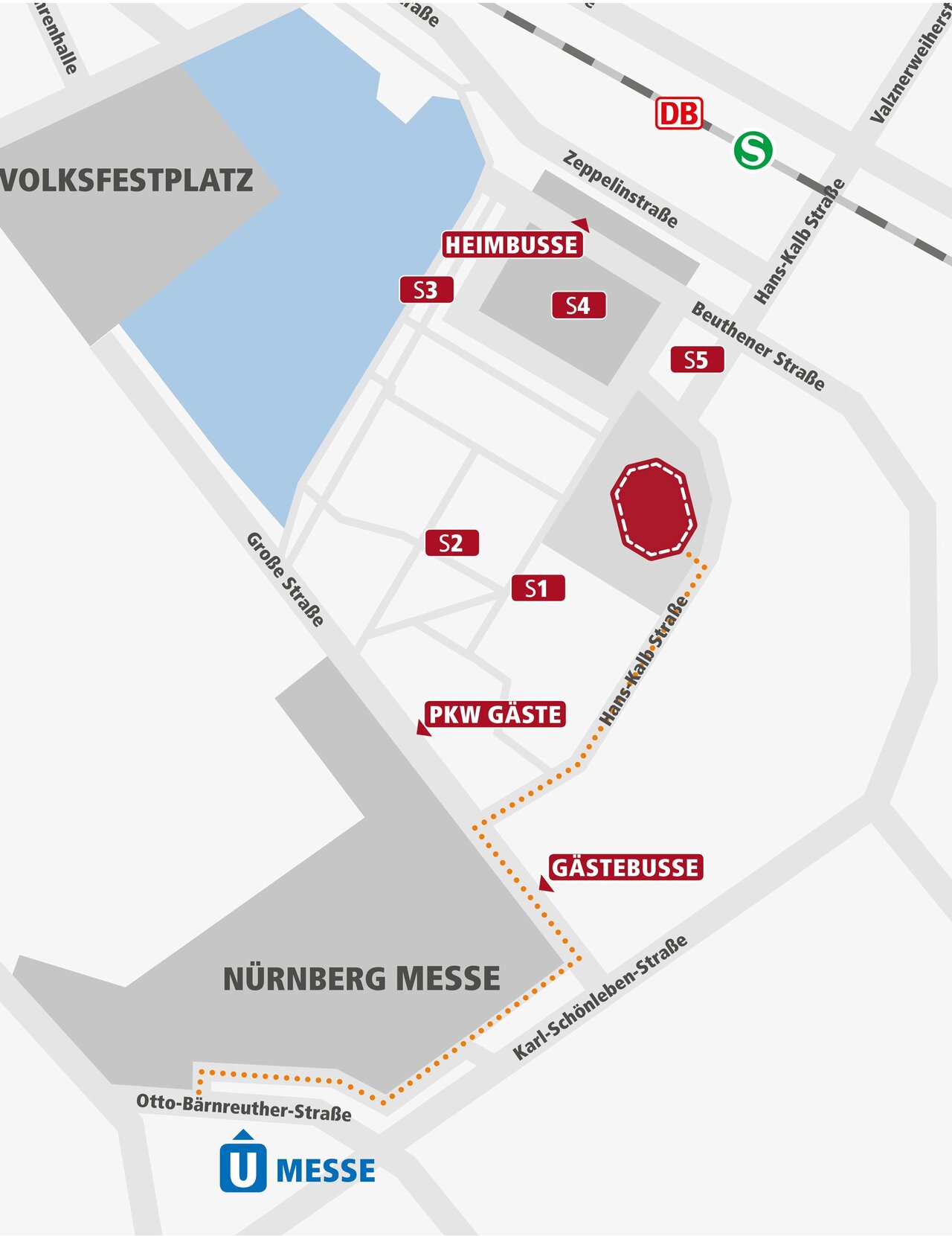 PKW/BusseFür alle Fan-Busse (15,-€) und Pkw-Fahrer (4,-€) empfehlen wir den Parkplatz „Große Straße“. Der Parkplatz ist ab der Autobahn (Kreuz Nürnberg oder BAB-Ausfahrt N-Fischbach) über das Verkehrsleitsystem beschildert. Einfach der Beschilderung „Gäste“ folgen. Der Fußweg zum Gästeeingang beträgt etwa 10-15 Minuten.Eine Umwelt-Plakette wird nicht benötigt.