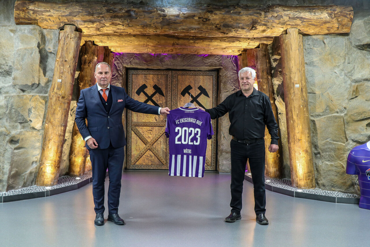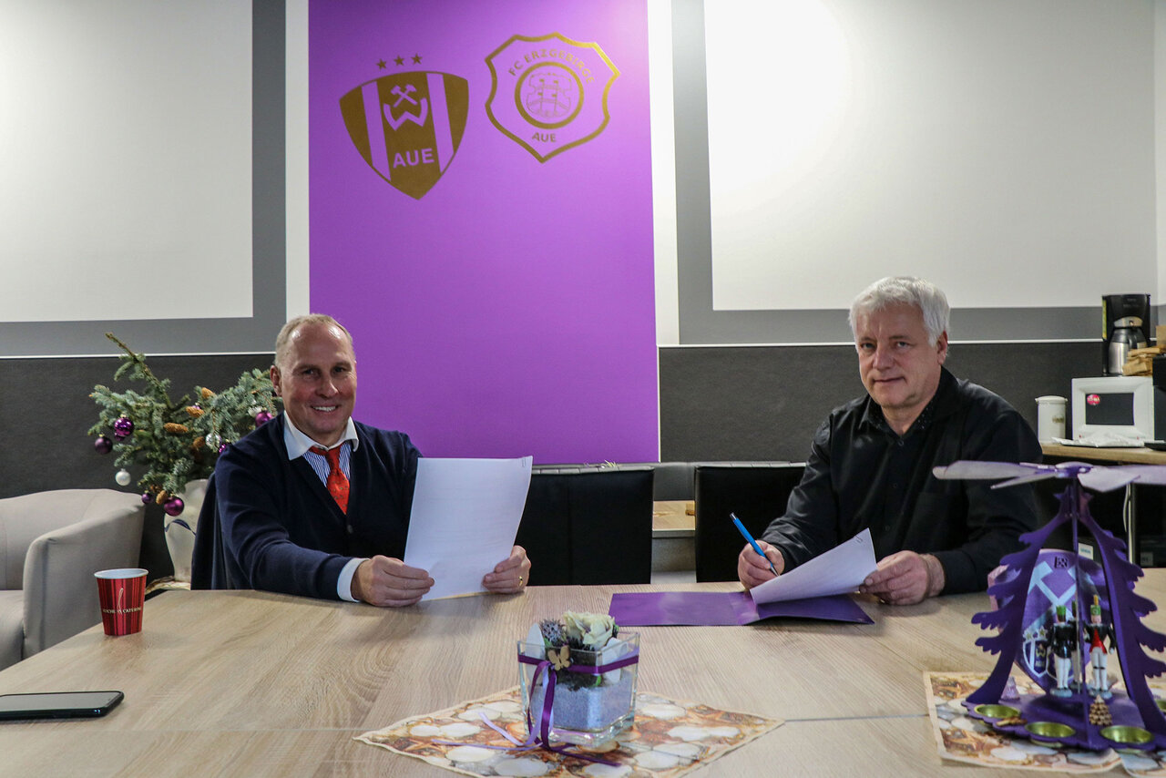 FCE-Präsident Helge Leonhardt und WÄTAS-Geschäftsführer Torsten Enders bei der Vertragsunerschrift.