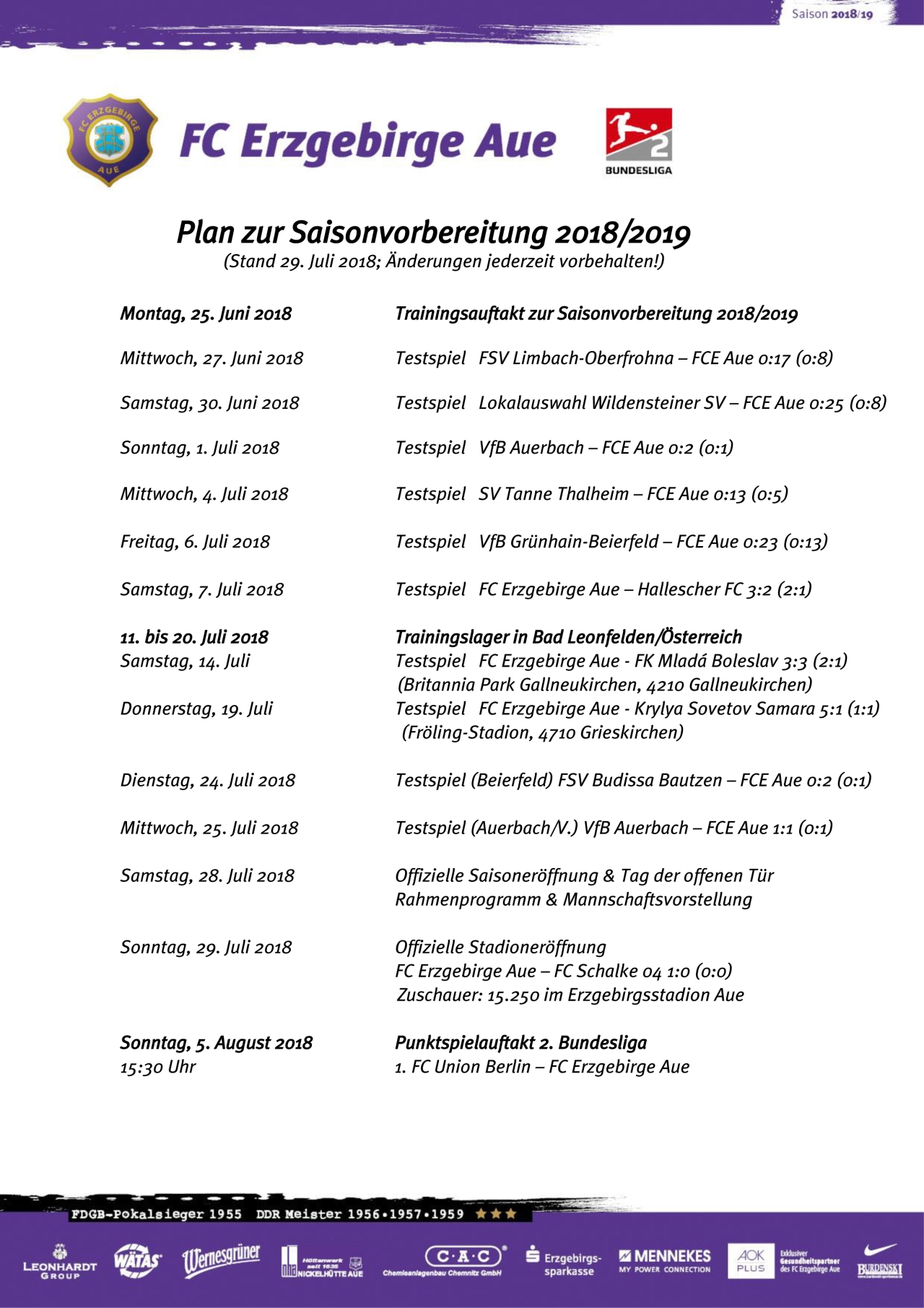 Aktualisiert: Plan zur Saisonvorbereitung 2018/2019