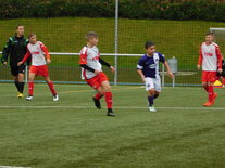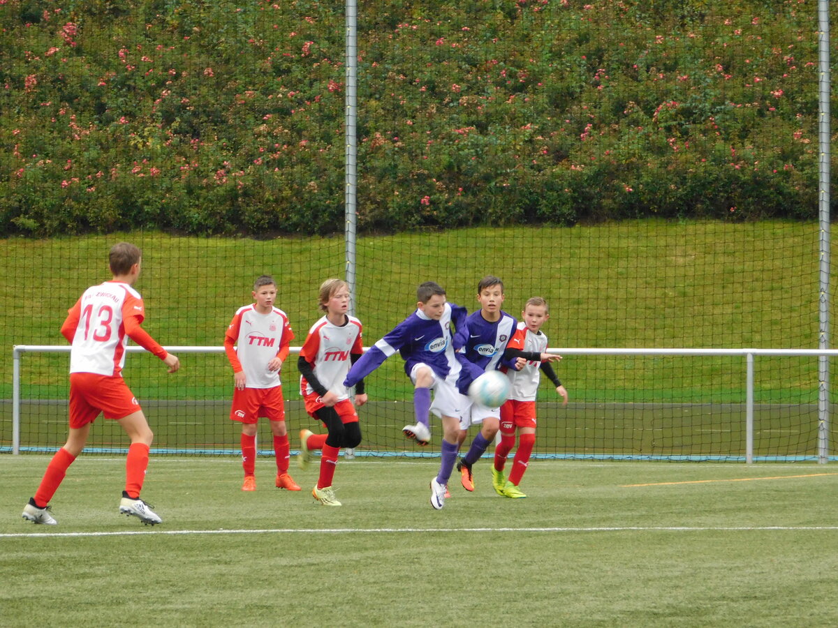 Schlechter hätte dieser Samstag für unsere jungen D-Junioren nicht starten können. Neben dem miesen Wetter fielen kurz vor dem Auswärtsspiel beim FSV Zwickau die Leistungsträger Noah Lenk und Samuel Urlaß krankheitsbedingt aus. Das zwang das Trainergespann um Jörg Lenk und Lars Kröber zum Handeln und so musste die Mannschaft nach den so starken Testspielleistungen gegen Hof und Freiberg komplett umgestellt werden. Um es vorweg zu nehmen - das umgekrempelte Team zeigte trotzdem eine ordentliche Leistung und erreichte bei den mit mehreren Spielern des älteren D-Junioren-Jahrgangs angetretenen Zwickauern ein absolut verdientes 2:2 Unentschieden. Bereits nach fünf Spielminuten unterlief unserer Keeperin Kyra Spitzner ein fataler Fehler, als sie sich vollkommen unbedrängt das Leder selbst ins eigene Tor legte. Aber es sollte gleichzeitig auch der einzige Fehler unserer jungen Torhüterin gewesen sein. In der Folge hielt sie einen Neunmeter der Zwickauer stark und zeigte über die restliche Spielzeit eine ganz starke und sichere Leistung. Nach dem frühen Rückstand drehten unsere jungen Veilchen auf und kamen folgerichtig in der 13. Minute durch Lennart Kröber zum Ausgleich. Nur fünf Minuten später gingen die jungen Zwickauer in einem packenden und gutklassigen Spiel erneut in Führung. Unser Team blieb aber weiterhin am Drücker und konnte kurz vor dem Pausentee durch einen von Tommy Stopp verwandelten Handstrafstoß erneut ausgleichen. Im zweiten Durchgang spielten dann beide Teams mit offenem Visier und hätten jeweils mit ein wenig mehr Glück auch beide das Spiel für sich entscheiden können. Am Ende blieb es dann aber bei diesem leistungsgerechten Unentschieden, das unseren jungen Veilchen Mut für die weiteren Aufgaben machen sollte. In Zwickau spielten: Kyra Spitzner (TW), Levin Leonhardt, Paul Börner, Niklas Häcker, Tommy Stopp (C/1), Toni Wagenknecht, Lennart Kröber (1), Fabio Westerhof, Paul Schneider, Chris Giesel und Nico Weber (ETW). Foto 1: „Capitano“ Tommy Stopp schwört die Mannschaft vor dem Match ein Foto 2: Lennart Kröber erzielte den zwischenzeitlichen Ausgleich Foto 3: Levin Leonhardt machte nach langer Verletzungspause ein gutes Spiel