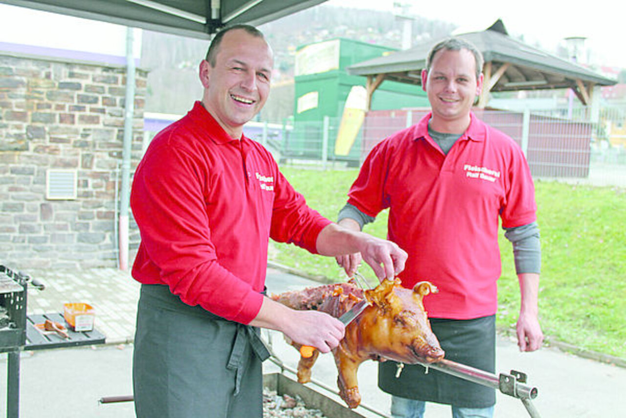 Fleischermeister Ralf Bauer (links) und Mitarbeiter René Kohlmann servierten den Bauleuten Spanferkel.