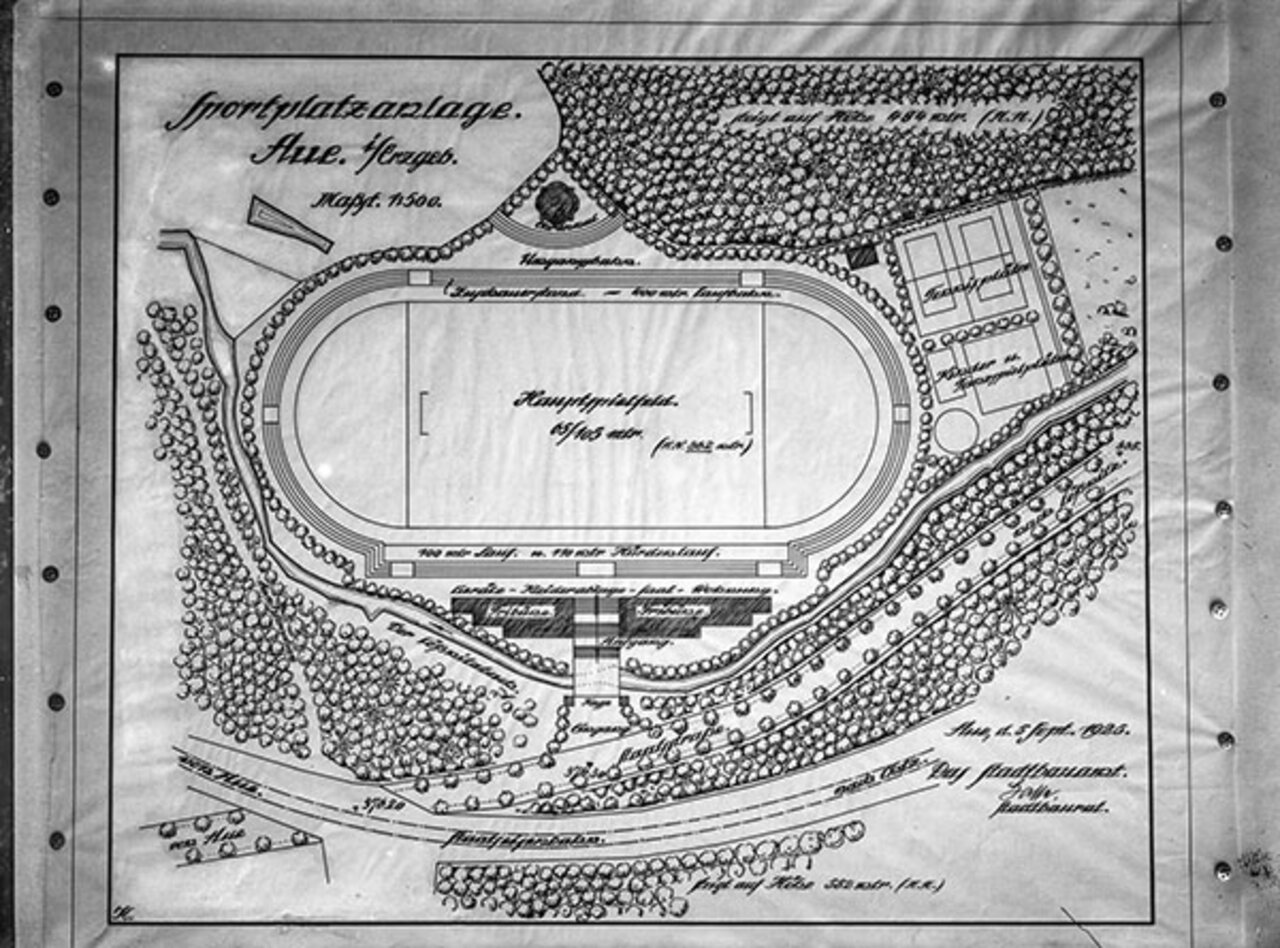 Am 27. Mai 1928 erschien unter der Überschrift „Zur Eröffnung der Sportplatzanlage in Aue” im „Erzgebirgischen Volksfreund” ein Artikel aus der Feder von Stadtbaurat Hasse. Darin wird zunächst die Notwendigkeit des Neubaus begründet: „Die Sportplatzanlagen in dem Stadtgebiet Aue waren bisher als sehr mäßig anzusehen. In der Flächengröße der Sportplätze stand Aue im Freistaat Sachsen an zweitletzter Stelle. Der Wunsch nach anderen Verhältnissen war deshalb berechtigt. Im Jahre 1925 wurde das Bauamt mit der Planung einer Sportplatzanlage beauftragt.” Als Ort sei nach vielem Suchen ein Gelände auf dem Zeller Berg gewählt worden. Allerdings habe sich bald gezeigt, dass die Sportplatzanlage hier äußerst teuer würde. „Es zeigte sich, dass die sogenannten Bauergutswiesen in der Nähe des Schlachthofes nördlich der Staatsstraße Aue – Lößnitz als geeignet anzusehen sind.” Als nachteilig wurde damals der „anscheinend sehr wasserreiche Grund” Freiübungsturner Aufstellung nehmen. Der Zuschauerstand bietet für 12.000 bis 15.000 Zuschauer Platz.” Hasse erwähnt besondere, mit Schlackendecken versehene Übungsfelder für Fußball, Handball und Hockey sowie für Kugelstoßen, Wurf- und Springübungen. „Auch für den Tennissport ist durch Anlegung zweier Tennisplätze gesorgt.”
