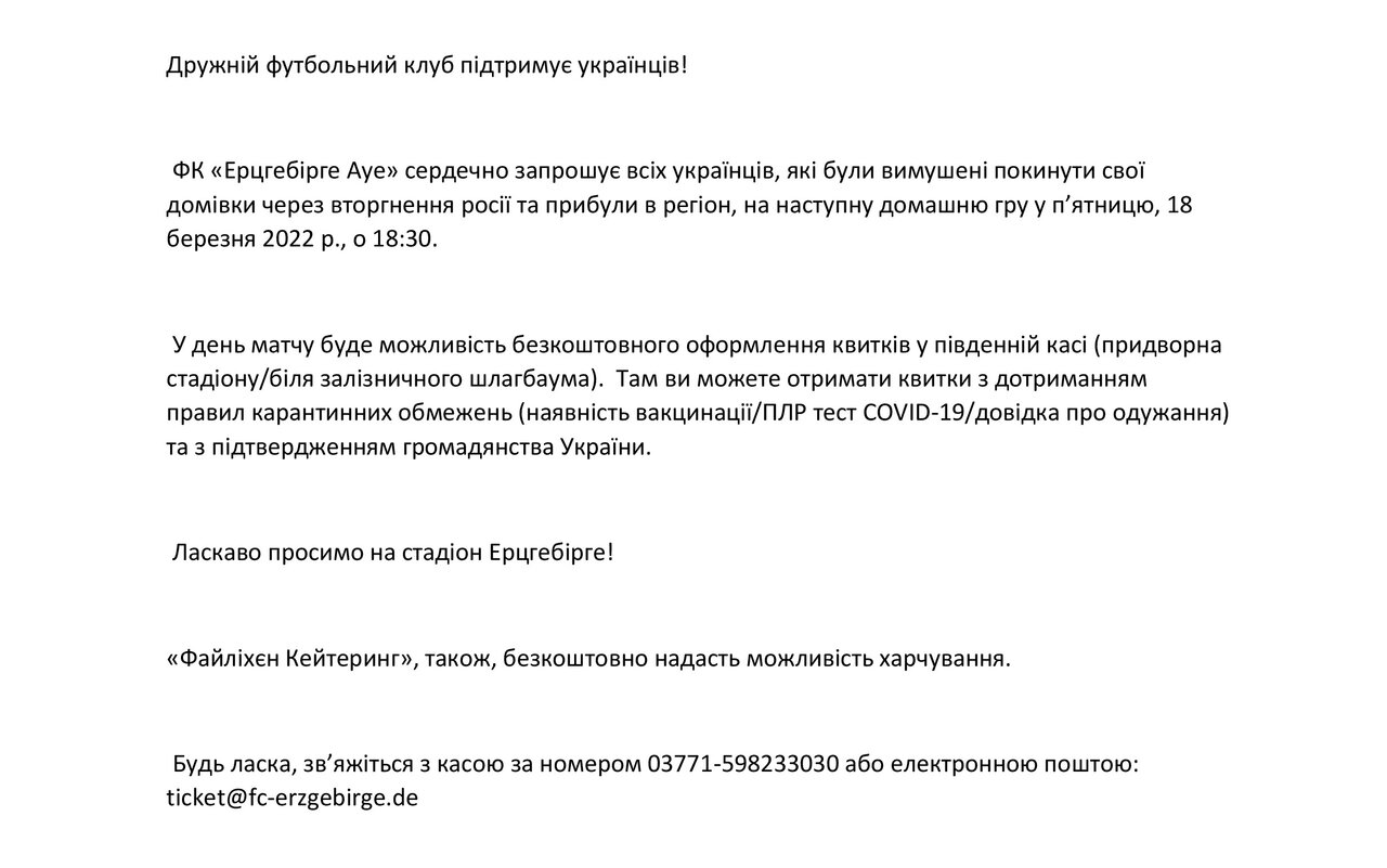 Der FC Erzgebirge Aue lädt hiermit alle in der Region angekommenen ukrainischen Flüchtlinge herzlich zu seinem nächsten Heimspiel am Freitag (18.03.2022) gegen den Karlsruher SC ein. Der Anstoß erfolgt um 18:30 Uhr.