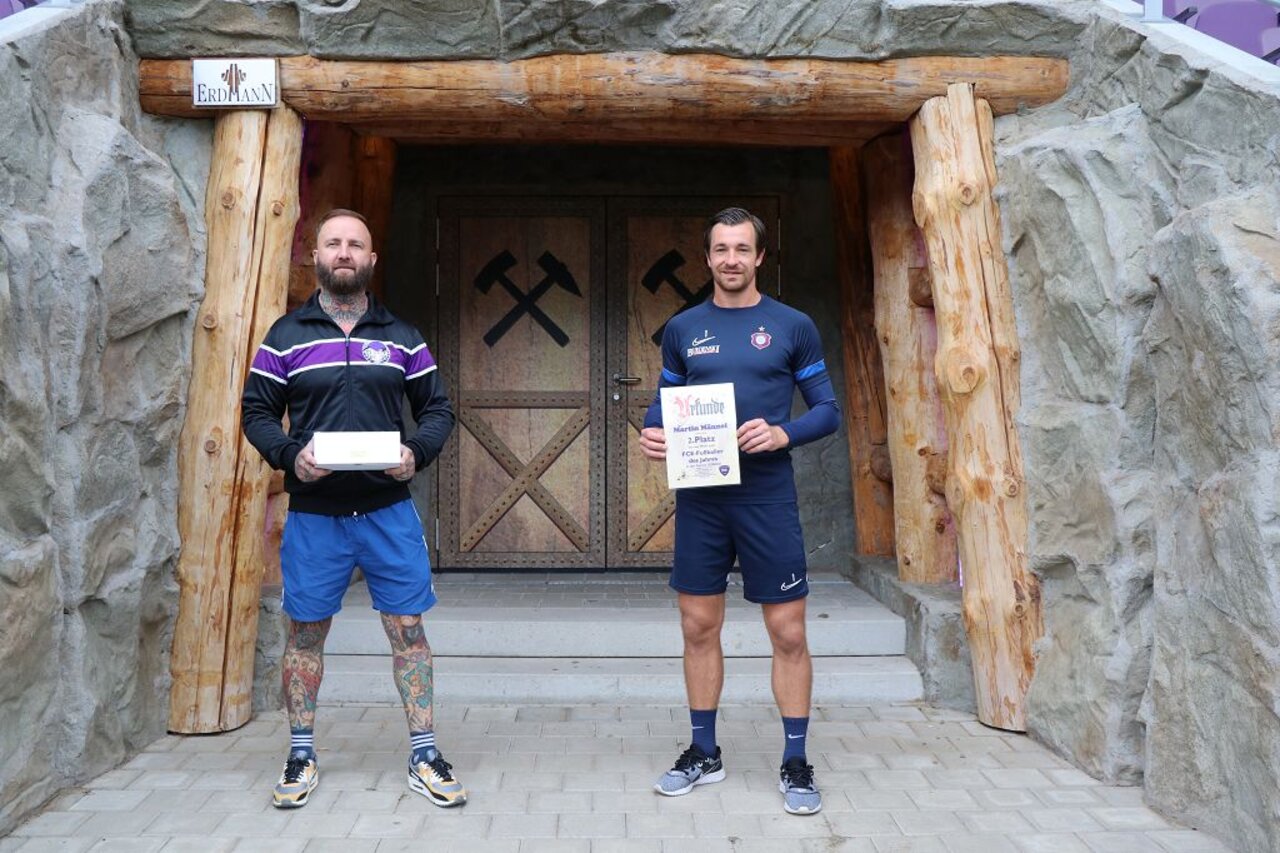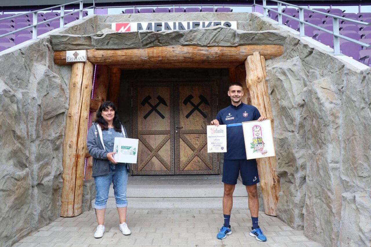 Der Aue-Stürmer und aserbaidschanische Nationalspieler erhielt zudem in guter Tradition eine originelle Karikatur mit seinem Konterfei und der Trikotnummer 10 plus Bergwerksmotiv. Die Zeichnung stammt aus der Feder von Martin Tröger aus Lößnitz. Dimitrij hatte knapp die Nase vorn vor Kapitän Martin Männel, der 20,8 Prozent der Stimmen erhielt. Ausgezeichnet wurden die beiden Publikumslieblinge am 5. August im Erzgebirgsstadion durch Michael Scheffler und Karolin Hambeck vom Fanprojekt sowie den FCE-Fanbeauftragten Heiko Hambeck. Nicht persönlich anwesend sein konnte Florian Krüger, der Drittplatzierte. Florian Krüger war nach seiner überzeugenden Saisonleitung zum Bundesligisten Arminia Bielefeld gewechselt. Er bedankte sich aber für die Unterstützung der Aue-Fans mit einem Video.