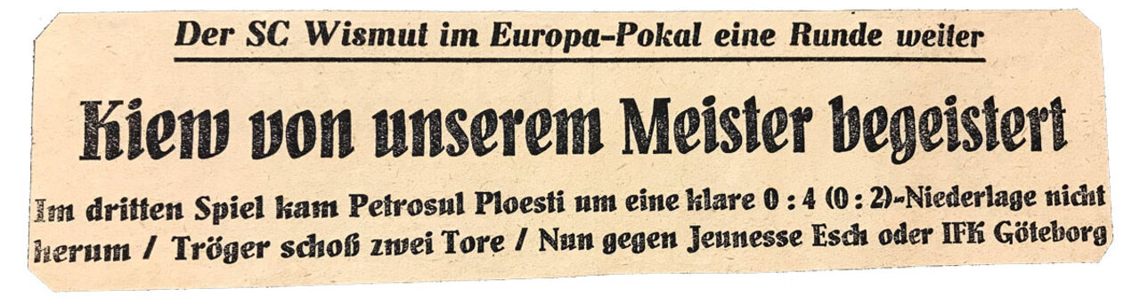 Am 12.10.1958 war es dann soweit, das Entscheidungsspiel in Kiew vor 40000 Zuschauern. Im dritten Spiel kam Petrolul Ploesti um eine klare 0:4 Niederlage nicht herum. Schon in der 4. Minute traf Wismut zum 1:0 (Zink). Das 2:0 folgte kurz darauf (Tröger). In der 48. Minute schoss Wolf das 3:0. Die harten und auch manchmal unfairen Rumänen gaben nicht auf, doch Tröger machte mit einem Elfmeter zum 4:0 den Deckel drauf. SC Wismut war eine Runde weiter im Europa-Pokal und traf im Achtelfinale auf IFK Göteborg. Der Rückflug aus Kiew hatte es noch mal in sich. Die Mannschaft nahm wieder nicht den direkten Weg nach Berlin, sondern machte einen Zwischenstopp in Moskau. Insgesamt war man vier mal in Moskau, erzählt Klaus Zink. Zweimal besuchten sie das Bolschoi-Theater und schauten den Schwanensee. Was aber bei keinem Besuch fehlen durfte, war der Halt an einer Eisdiele, die das beste Eis in Moskau verkaufen würde.