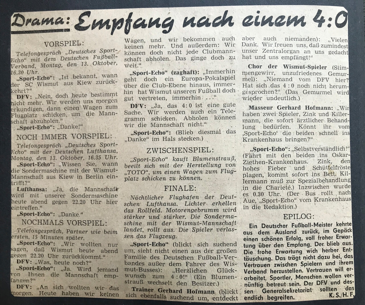 Am 13. Oktober um 22:20 Uhr landete die Wismut mit einer Sondermaschine am Flughafen in Berlin und wunderte sich, dass sie nur von ihrem Busfahrer empfangen wurde. Da hatte sich das Weiterkommen im Europapokal der Landesmeister wohl noch nicht rumgesprochen, wunderte sich die Mannschaft, weil niemand vom DFV da war. Einzig ein Journalist vom Sport-Echo überreichte einen Blumenstrauß. Masseur Gerhard Hofmann sagte dann nur: " Wir haben zwei Spieler, Zink und Killermann, die sofort ärztlicher Behandlung bedürfen." Zink den hohes Fieber und Schüttelfrost plagte, musste sofort ins Bett, da er im Flieger auch schon gebrochen hatte. Killermann musste sogar in Spezialbehandlung in die Charietè. Da war das Eis in Moskau doch nicht so gut für den Magen, wie alle gedacht hatten. Inzwischen war es 00:30 Uhr und der Bus rollte nach Aue zurück.
