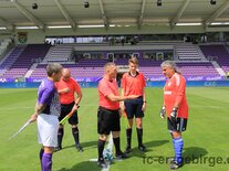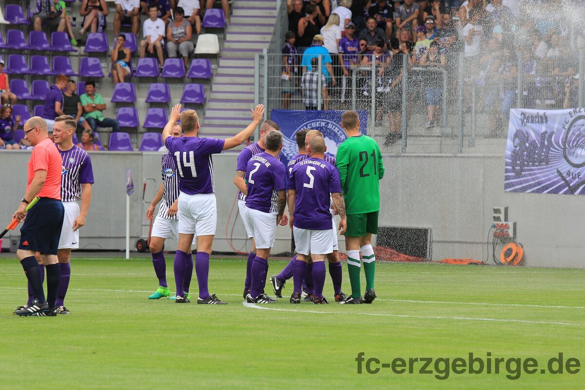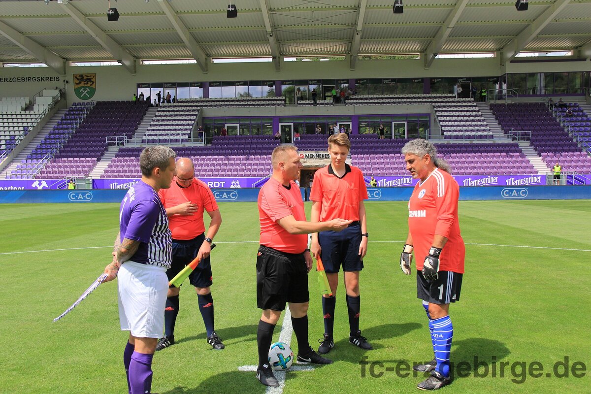 Vor der feierlichen Einweihung des Erzgebirgsstadions, durch das Spiel zwischen dem FC Erzgebirge Aue und Schalke 04 stand ein freundschaftlicher Vergleich zweier Fanauswahlmannschaften der beiden Bergbautraditionsvereine auf dem Programm. Punkt 13:25 Uhr war Anstoß zu dem halbstündigen im Erzgebirgsstadion ausgetragenen Spiel. Bei welchem sich das Auer Team am Ende 3:0 durchsetzen konnte. Trotz tropischen Temperaturen entwickelte sich ein ansehnliches Spiel mit Chancen auf beiden Seiten. Auf Schalker Seite stand eine Auswahl von Schalke Fanclubs auf dem Platz, die zum größten Teil ihre Heimat im Osten Deutschlands haben. Für unseren Verein liefen zum Großteil Mitglieder der aktiven Fanszene auf. Jedoch war das Ergebnis am Ende nur eine Nebensache, den sowohl für die Auer, als auch für die Schalker Fans, war es ein unvergessliches Erlebnis vor so vielen Zuschauern zuspielen und sich somit einen Kindheitstraum jedes Fußballers und Fußballfans zu erfüllen. Auch dank der obligatorischen Hämmer, vor der gut gefüllten Westtribüne dürfte das Match wohl bei allen Beteiligten noch ewig im Gedächtnis bleiben.