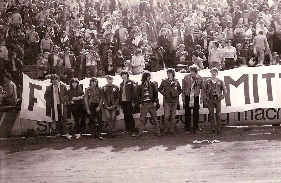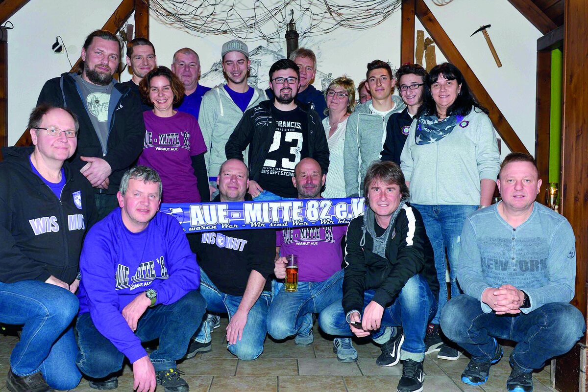 Am 11. Februar feierte mit dem Aue-Mitte 82 e. V. der älteste noch existierende Veilchen-Fanclub beim „Wegelagerer” in Bad Schlema 35-jähriges Bestehen. Unter den heute 17 Mitgliedern sind drei, welche die damals „Club der fördernden Mitglieder der BSG Wismut Aue ,Fanclub Aue-Mitte’” getaufte Gruppe am 20.2.1982 mitgegründet hatten: Thomas Stibane, Volkmar Scharkus und Klaus Steffan. Der sperrige Ursprungsname musste gewählt werden, weil es damals statt des westlichen Ausdrucks Fans eher Schlachtenbummler oder Fußballanhänger heißen sollte. Richard Velek, der neue Leiter der Sektion Fußball, hatte sich aber für „Aue-Mitte” stark gemacht. Offiziell von 80 Personen ins Leben gerufen, pegelte sich die Zahl der Aktiven bald bei 20 bis 30 jungen Leuten ein, die meist aus dem Auer Zentrum kamen und gemeinsam zu Auswärtsspielen reisten. Freilich war es nicht der erste Wismut-Fanclub; ältere wie „Die Veilchen” oder die „Brigade Hoff” gibt es jedoch heute nicht mehr. Gemeinsam mit „Brünlasberg” und den „Drei Tannen” aus Thalheim zählte „Aue- Mitte” zu den größten Fangruppen des Traditionsvereins. „Punkt” Steinbach vom Fanprojekt und FCE-Fanbeauftragter Heiko Hambeck waren schon in den achtziger Jahren dabei, als Zugfahrten zum FC Hansa Rostock in Tagen gemessen wurden. Man nahm an drei DDR-Fanclub-Meisterschaften teil, durfte die geplante vierte aber nicht in Aue ausrichten. Aue-Mitte organisierte vor der Wende Fußballturniere für Aue-Fanclubs und Auswärtstouren, maß die Kräfte in Freundschaftsspielen mit Fankickern anderer Oberligisten.