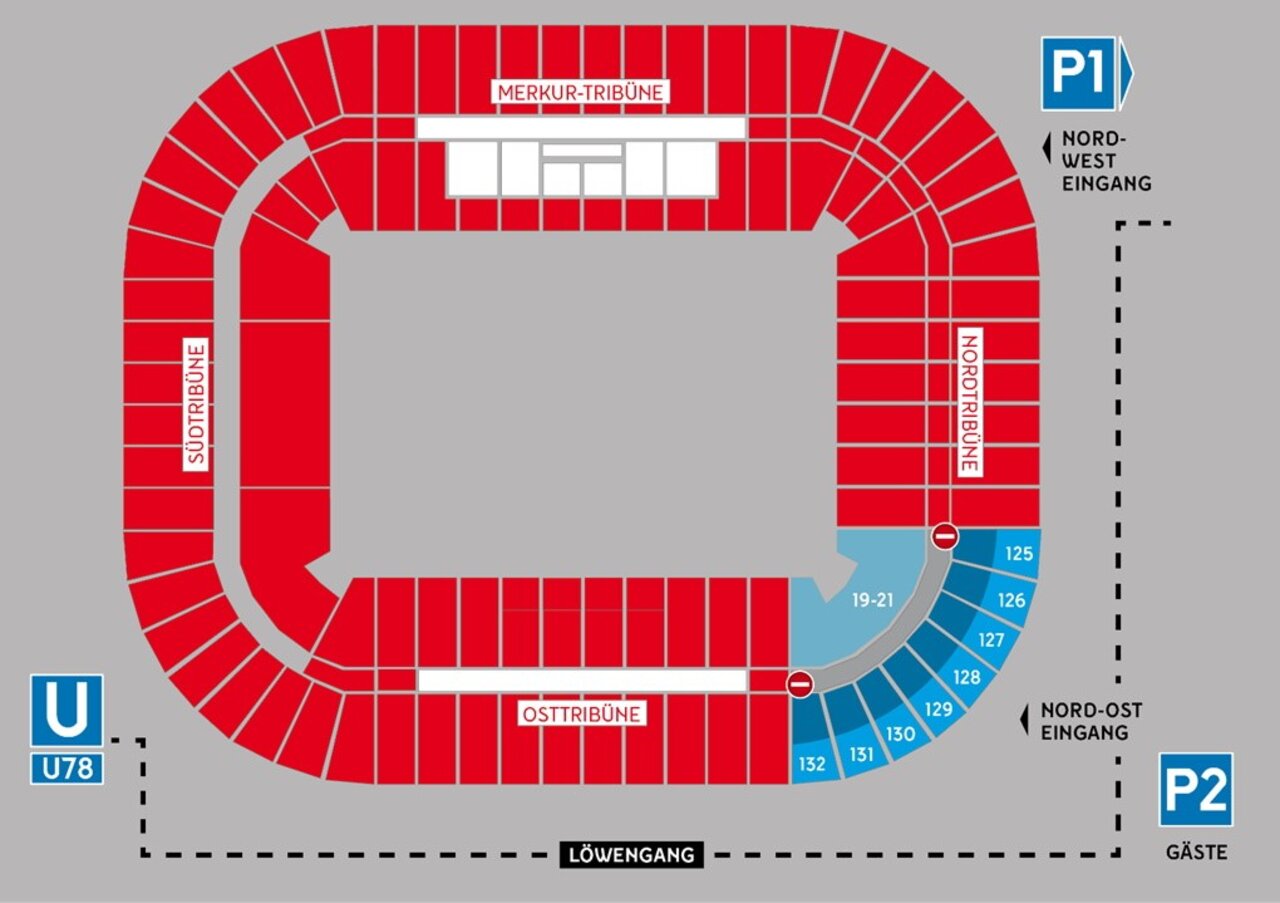 Hierfür sind zwei Plätze für Gäste-Fans im Block 1 auf der Merkur Tribüne reserviert.