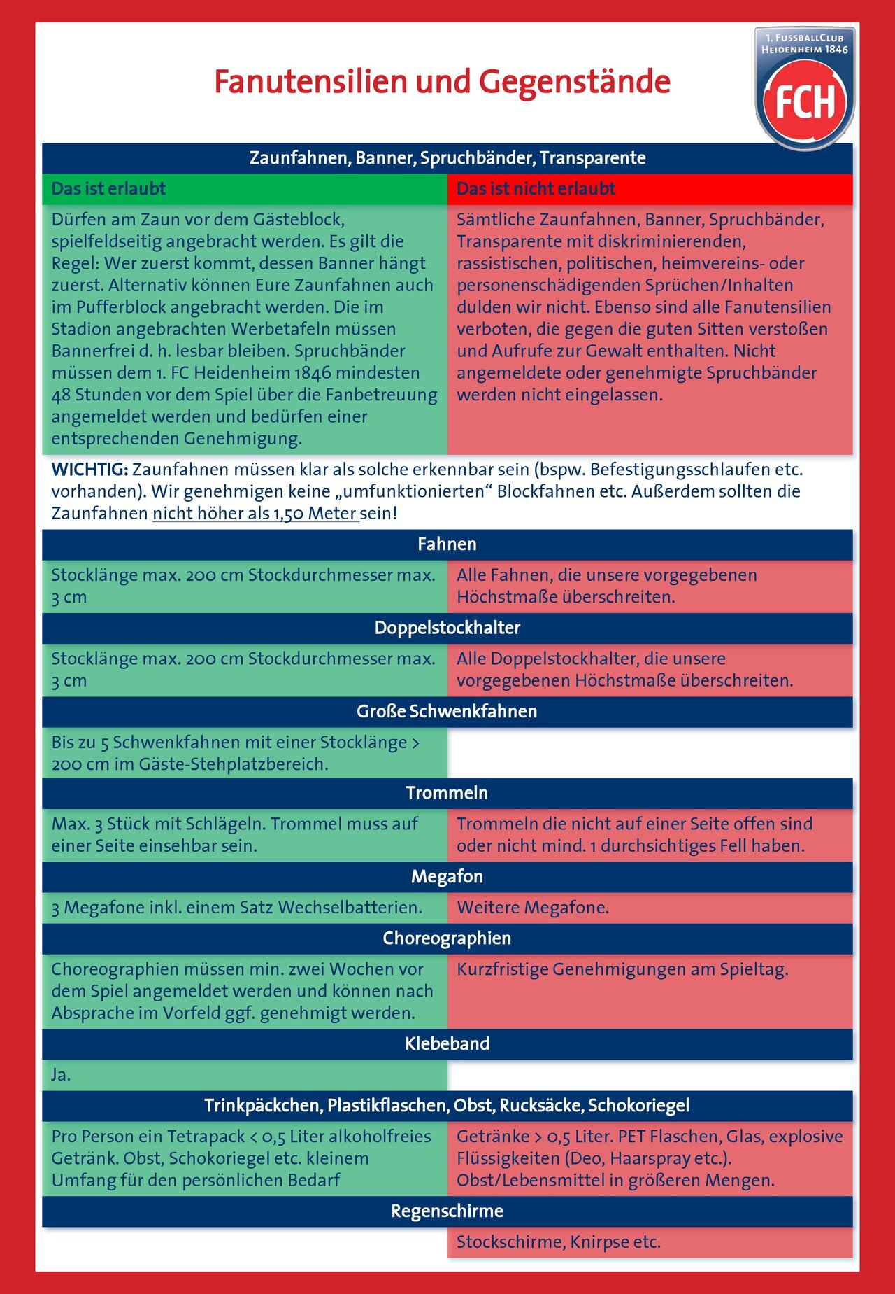 Feuerwerkskörper, Leuchtkugeln und andere pyrotechnische Gegenstände, namentlich so genannte bengalische Fackeln und Rauchpulver etc. dürfen grundsätzlich nicht mitgeführt werden. Es drohen bei Nichtbeachten empfindliche Strafen und Stadionverbot! Sollte es zum Abbrennen von Pyrotechnik kommen, kann es bei zukünftigen Spielen Eurer Mannschaft in Heidenheim erhebliche Einschränkungen im Bereich Fanutensilien geben!