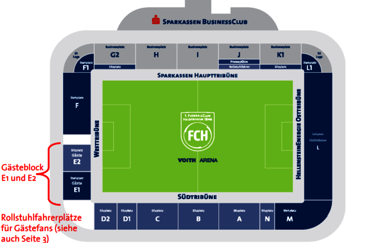 Beachtet bitte, dass die Blöcke L, L1, M und F1 die Heimbereiche des 1. FC Heidenheim 1846 sind. Dort ist es unerwünscht, Farben und Fanartikel der Gastmannschaft zu tragen, verbale Äußerungen zu tätigen oder provozierend aufzutreten. Der Ordnungsdienst ist berechtigt, bei möglichen Vorfällen einzuschreiten und Zuschauer aus diesen Bereichen zu entfernen.