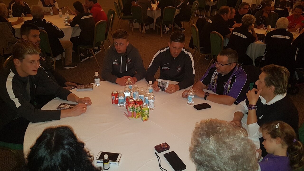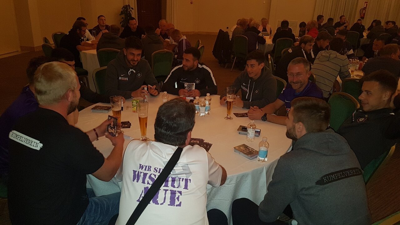 Spieler, Trainer, Sponsoren und Fans im gemeinsamen Ausstausch. Unter anderem wurde der bisherige Verlauf des Trainingslagers besprochen und ein Blick auf den Punktspielstart geworfen. Natürlich schrieben unsere Veilchen zahlreiche Autogramme und so manches gemeinsames Erinnerungsfotos wurde geschossen. Ein gelungener Abend im Veilchencamp beim Kumpelverein!