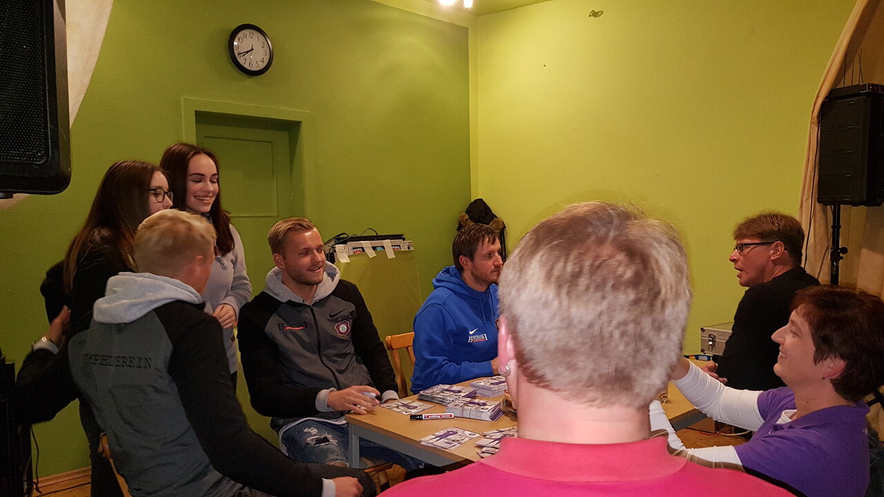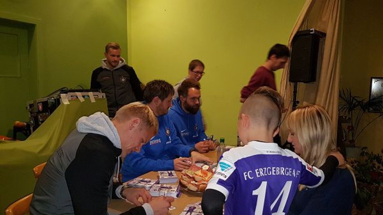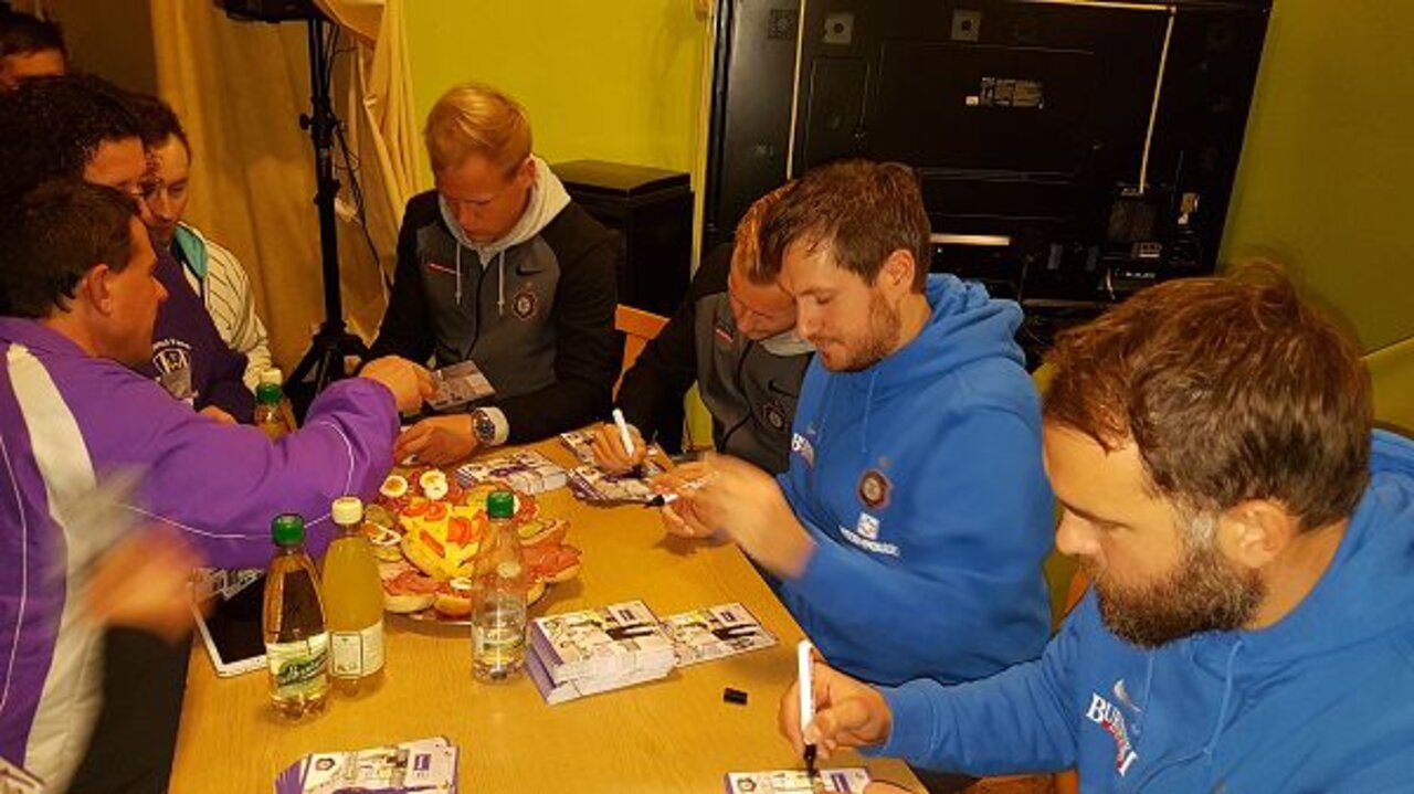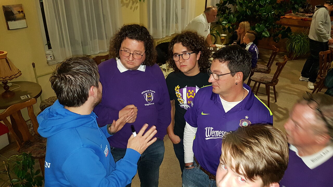 Am Dienstag, den 14.11.2017, war ab 18:30 Uhr die „Wackerbud“ in Plauen, nach knapp 10 Jahren wieder einmal Gastgeber für unseren 2. Fanstammtisch der Saison 2017/18.Neben Cheftrainer Hannes Drews und Torwarttrainer Max Urwantschky hatten sich unsere beiden Toptorschützen Pascal Köpke und Sören Bertram mit auf den Weg in die Spitzenstadt gemacht.Mehr als 70 Veilchenfans erlebten eine tolle Gesprächsrunde in sehr lockerer Atmosphäre. Im Anschluss gaben unsere Veilchen noch reichlich Autogramme und standen für so manches Erinnerungsfoto zur Verfügung. Am Ende überreichten unsere Jungs dem Gastgeber Wolfgang Dörschel noch ein Erinnerungsfoto!