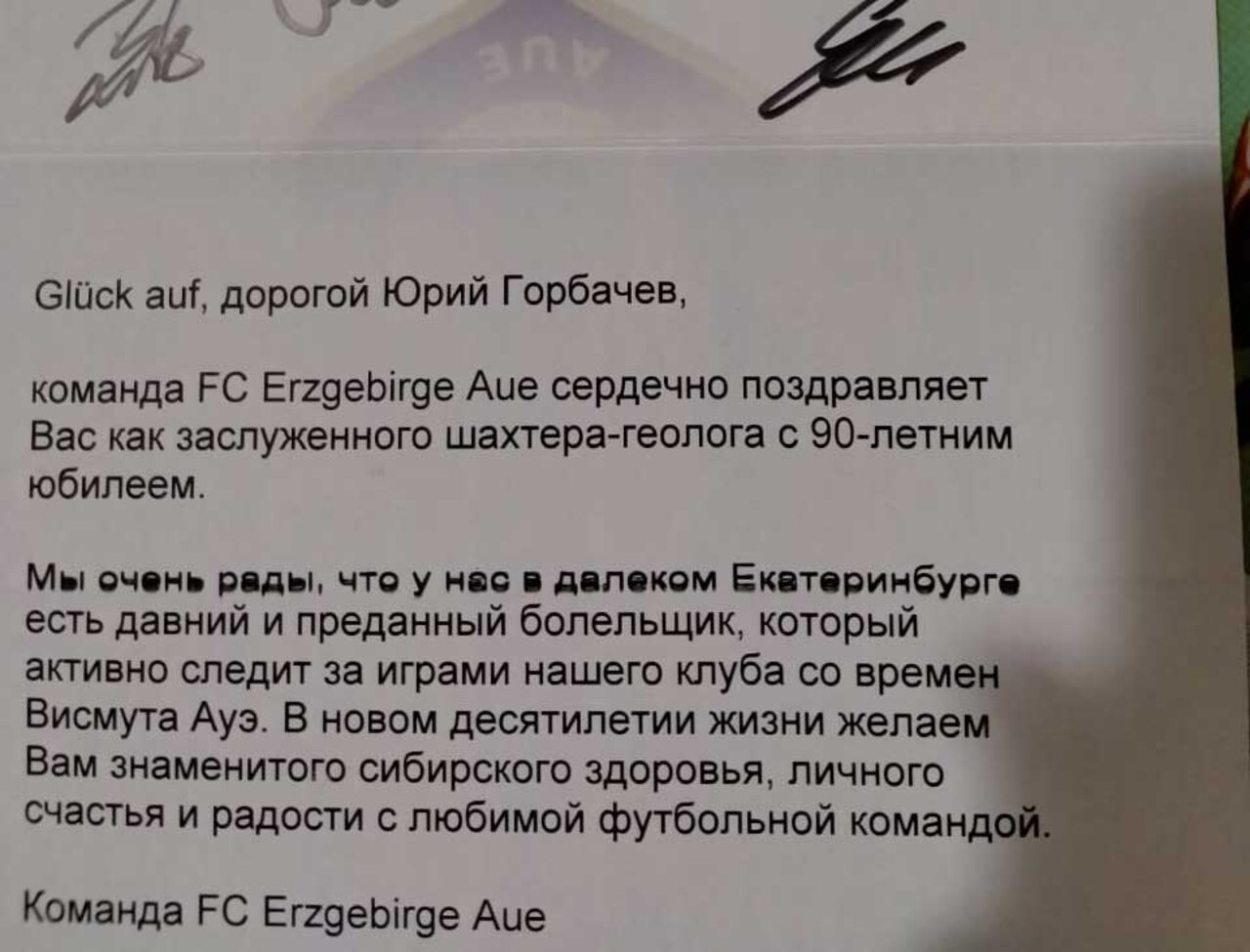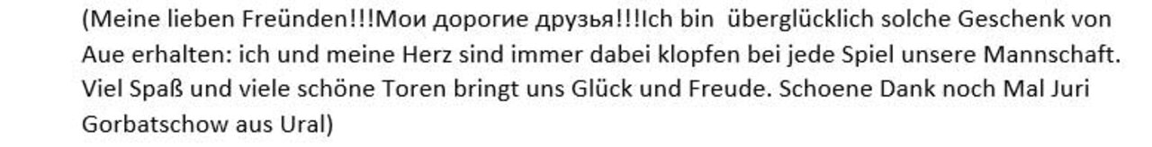 "Meine lieben Freunden!!!ch bin überglücklich solche Geschenk von Aue erhalten: ich und meine Herz sind immer dabei klopfen bei jede Spiel unsere Mannschaft. Viel Spaß und viele schöne Toren bringt uns Glück und Freude. Schoene Dank noch Mal Juri Gorbatschow aus Ural"
