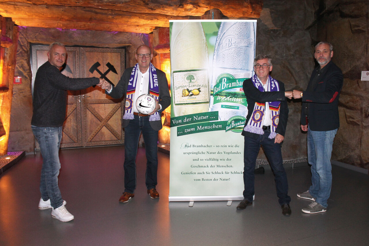 Auch die Bad Brambacher Mineralquellen GmbH & Co. KG als eine Marke der Kulmbacher Gruppe ist ab dieser Saison neuer Co-Sponsor unseres Vereins. Michael Dorner, Geschäftsführer der Erfrischungs-Getränke-Union Kulmbacher Gruppe GmbH (2. von links), und Dietmar Karger von der Bad Brambacher Geschäftsleitung (2. von rechts) besiegelten die Partnerschaft am 14. Oktober im Erzgebirgsstadion. „Gerade in schweren Zeiten wie jetzt freuen wir uns, wenn sich starke Unternehmen zu unserem Verein bekennen und Zeichen setzen, dass es in der Region vorangeht”, bedanken sich FCE-Geschäftsführer Michael Voigt und -Marketingchef Enrico Barth. Mehr zu Bad Brambacher steht im Veilchenecho am 31. Oktober (Aue – Kiel).