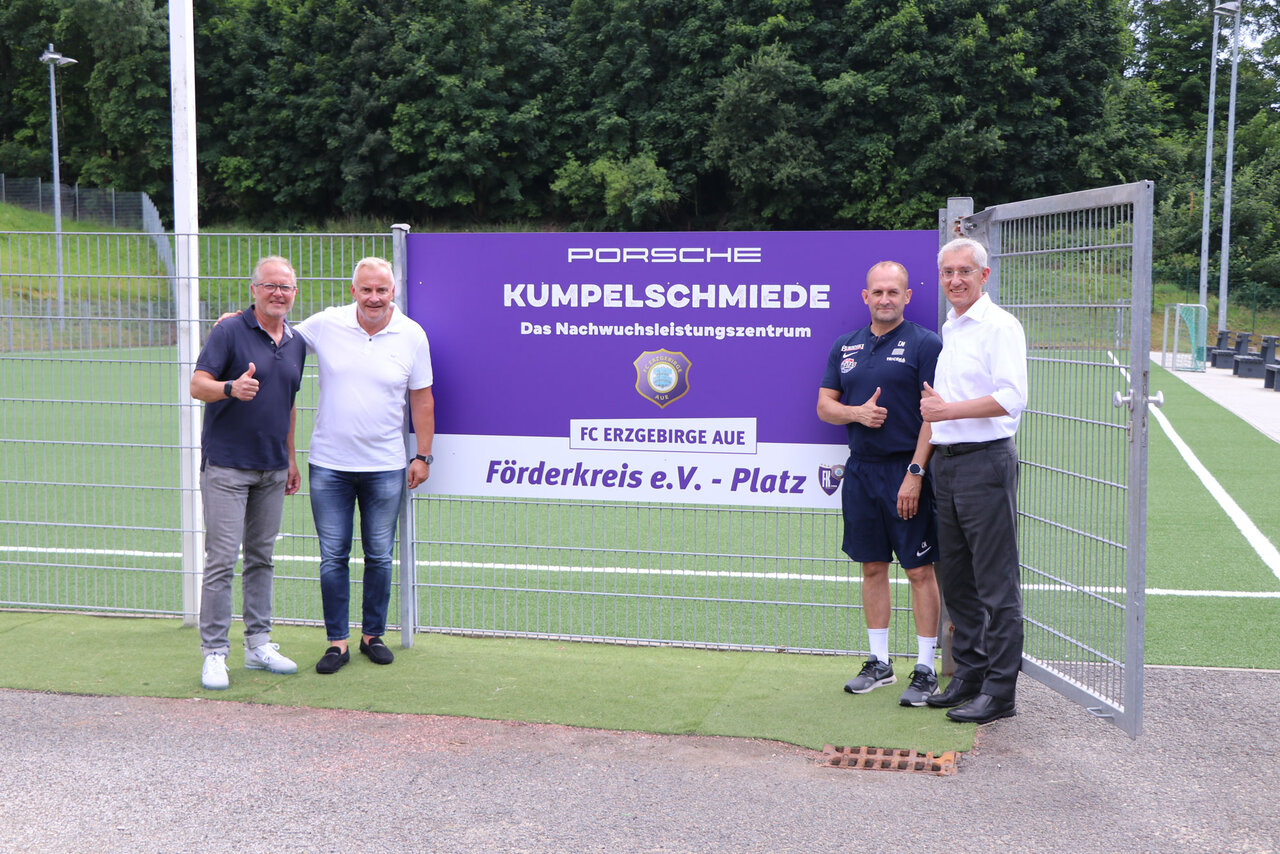 Stark ist zum Beispiel die finanzielle Hilfe, welche die Förderkreismitglieder, überwiegend einheimische Unternehmer, für ihren lila Herzensverein leisten. Geld, dass nicht nur dem Profiteam, sondern ebenso dem Nachwuchssport und allen FCE-Abteilungen zugute kommt. Obendrein unterstützt die Sponsorenfamilie Projekte wie den rundum erneuerten Kunstrasenplatz im Stadiongelände, der just an dem Mittwochabend eingeweiht wurde. Der „Anpfiff” dort erfolgte vorm Grillen durch die FK-Vorstände Hans-Ulrich Biernert und Robert Scholz sowie FCE-Geschäftsführer Michael Voigt.