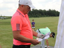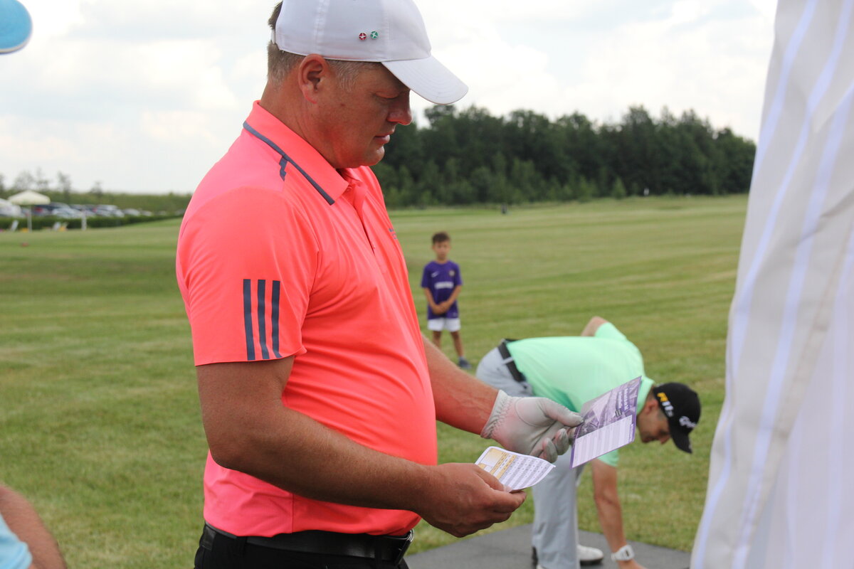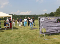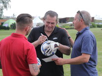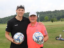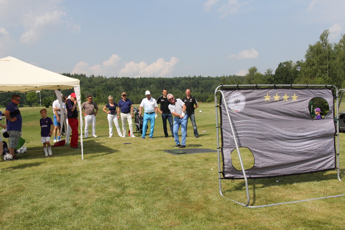 Im Golfpark Westerzgebirge wurde letzten Samstag ein Turnier von Golfern und Nichtgolfern zugunsten Sport-Vereine der Region, unter anderem dem Nachwuchs des FC Erzgebirge Aue, durchgeführt. Prominente Sportler aus den Bereichen Radsport, Leichtathletik, Eishockey, Ski, Fußball, usw. darunter Holger Erler, Michael Hübner, Falko Weißplog, Kevin Roch vom EHV, Michael Kiesewetter, Matthias Mauksch. Das Startgeld zum Spiel mit einem Prominenten betrug 150 Euro. Es spielten immer ein Golfer und ein Nichtgolfer zusammen. Unser Präsident Helge Leonhardt ging zum Beispiel mit Sophie Scheder, Olympiadritte am Stufenbarren, auf die Runde. Auf der 9-Loch-Runde mussten die Golfer auch mit dem Golfball auf eine Torwand zielen, was sich als gar nicht so einfach erwies. Auf dem Foto versuchte der 7-fache Radsprint-Weltmeister Michael Hübner sein Glück: