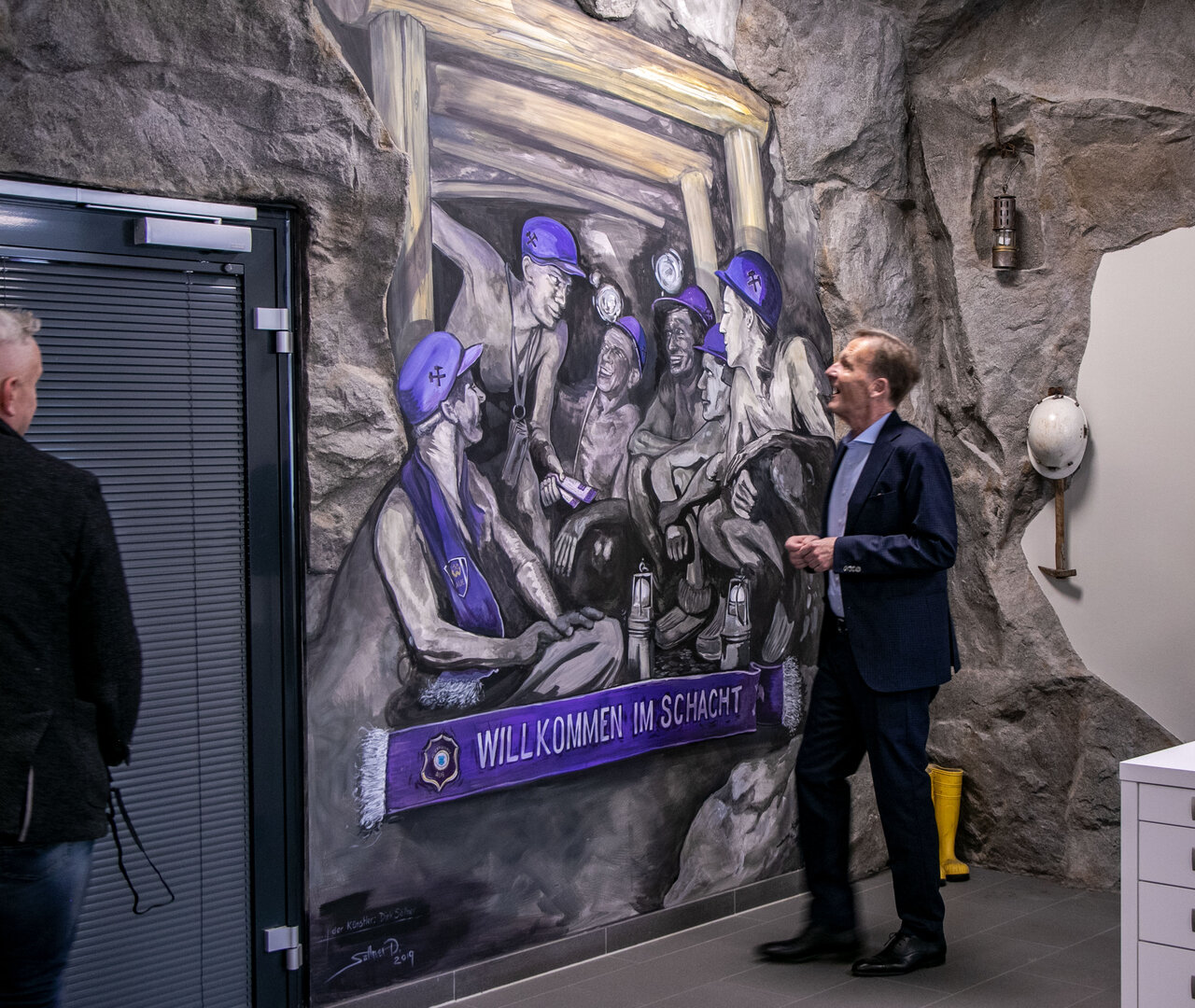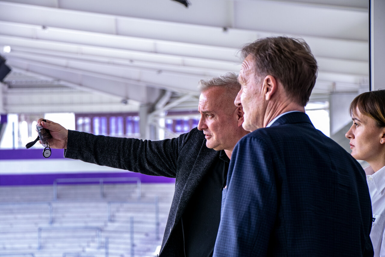 Der DFB-Vizepräsident und Chef des DFL-Aufsichtsrats, Hans-Joachim Watzke, war heute (13.4.22) zu Gast bei uns in Aue. FCE-Präsident Helge Leonhardt empfing ihn am Vormittag vor der Geschäftsstelle (Foto oben). Nach einem gemeinsamen Gespräch mit Mitgliedern des Vorstandes und Aufsichtsrats führte FCE-Geschäftsführer Michael Voigt unseren Gast aus Dortmund durchs Erzgebirgsstadion. Natürlich durfte dabei auch ein Gang durch die Veilchen-Kabine nicht fehlen.