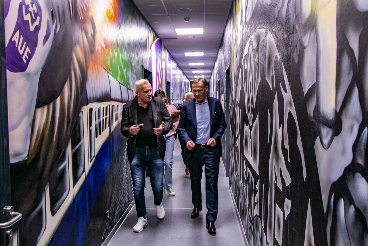 Hans-Joachim Watzke: "Großartig! Was man hier auf die Beine gestellt hat, wenn man bedenkt, dass Aue nur um die 20.000 Einwohner hat, dann ist das grandios. Man merkt auch, dass die Leute hier mit unfassbarer Empathie unterwegs sind. Ich habe mir alles angeschaut und einen super Eindruck vom Verein gewonnen."