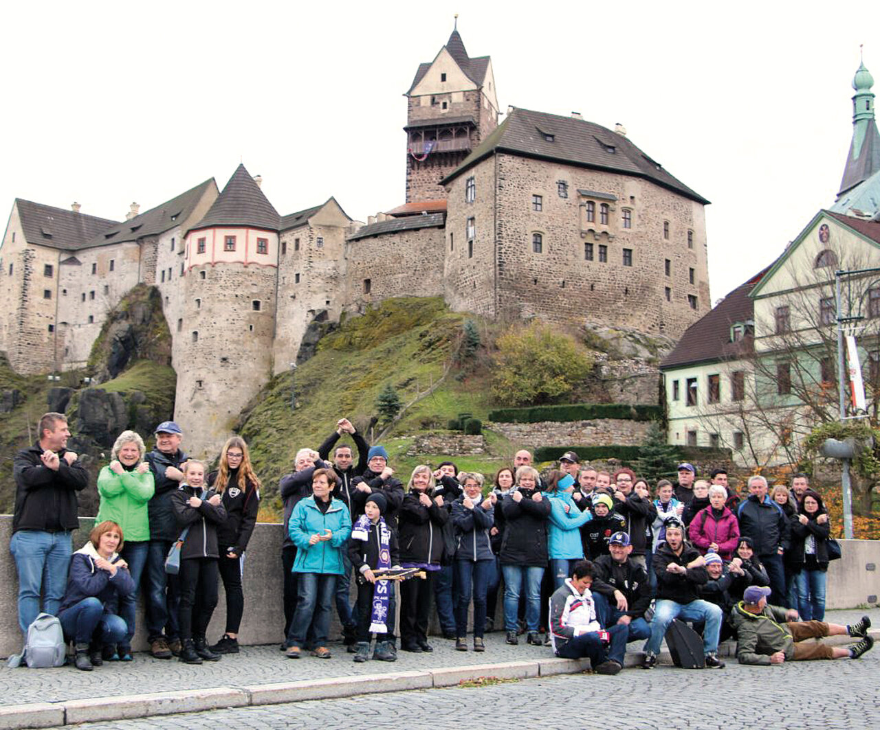 Im Fanklub aber sind die beiden Mädels beileibe nicht die Jüngsten, das sind aktuell Ella und Milo – eben erst ein Jahr geworden, sind die Zwerge schon von Kopf bis Fuß lila-weiß gekleidet (Bild links). Andere sind hingegen schon jenseits der Siebzig und standen, so wie zum Beispiel Hans Vulturius, schon in den Fünfzigerjahren im Lößnitztal hinter ihrer Wismut. Rund 40 Veilchenfans zählt der Klub, davon gehört ein Dutzend zum harten Kern, der kaum ein Spiel auslässt. Gern nutzen sie die Vogtlandlinie der Fanbusse, die in Morgenröthe-Rautenkranz und Jägersgrün halten. Wenn die „Hämmer” eine Ausfahrt, Wanderung oder Fete planen, sind natürlich auch Familienmitglieder und Freunde dabei. Mit ihrer Klubfahne sowie T-Shirts und Jacken im Look der „Eiskalten Hämmer” sind die Lila-Weißen aus dem oberen Muldetal überall präsent, wo der Aue-Ball rollt. Etliche Male durften Mitglieder schon die Mega-Veilchenbanner vorm Heimspiel schwenken. Klublokal ist gewöhnlich die Rautenkranzer „Frischhütte”, hier fand auch der erste Fanstammtisch – damals mit Trainer Falko Götz und Profi Thomas Paulus – statt. Später gab’s noch einen mit Pavel Dotchev und derzeit bemüht man sich um einen weiteren Termin. Tradition haben die alljährliche Saisonabschlussparty und (meist noch im Schnee) die Karfreitagswanderung. Enrico Schubert rollt zur Ostertour die fahrbare Schutzhütte ran und serviert Picknick und Glühwein. Gemeinsame Ausflüge führten zum Beispiel nach Böhmen auf die Burgen Loket und Kynsperk. Hat ein Mitglied rundes Wiegenfest, legen alle zusammen für ein Geschenk aus dem FCE-FanShop. Für 2018 sind eine Osterwanderung nach Beerheide, ein Fanstammtisch und ein Auswärtsbus in Arbeit. Doch vor allem hoffen die „Eiskalten Hämmer”, dass es zur Saisonabschlussfete im Mai wieder den Klassenerhalt zu feiern gibt. Aue-Fans, speziell aus dem oberen Vogtland, sind immer willkommen. (OS)