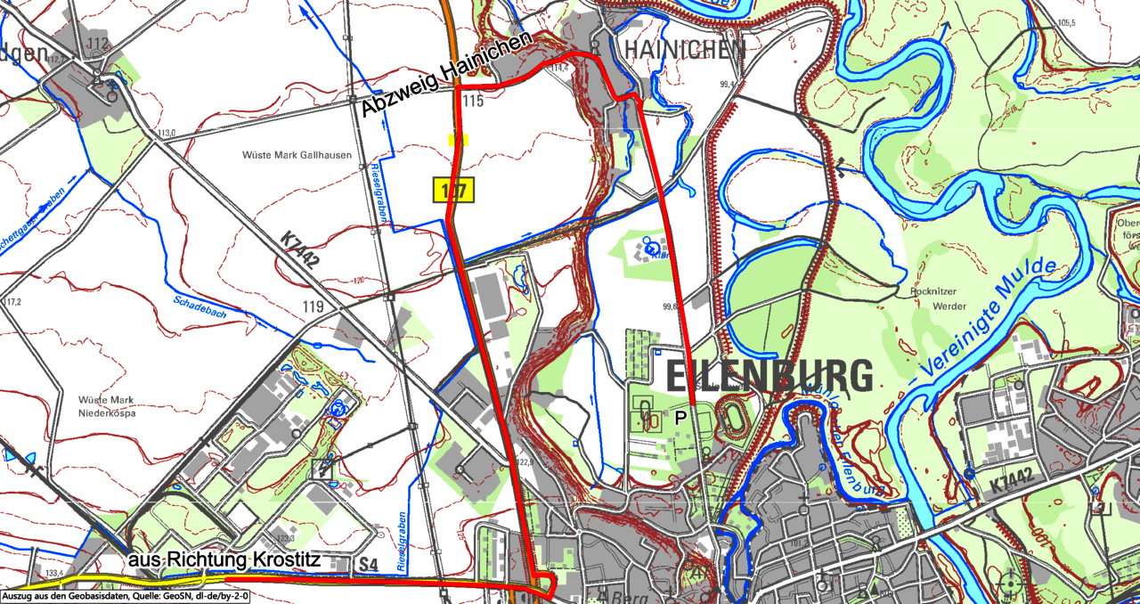 Anreise über die A72 bis Borna - B95 bis zur A38 - A38 bis zum Dreieck Parthenaue A14 - A14 bis zur Abfahrt Leipzig Mitte B2 - B2 bis zur Ampelkreuzung in Krostitz, rechts auf die S4 in Richtung Eilenburg - Ortseingang Eilenburg an der 1. Ampelkreuzung nach links in Richtung Bad Düben - auf der B107 am Abzweig Hainichen nach rechts abbiegen - durch die Ortslage Hainichen durchfahren, dann befindet sich das Stadion auf der linken Seite und der Parkplatz auf der rechten Seite