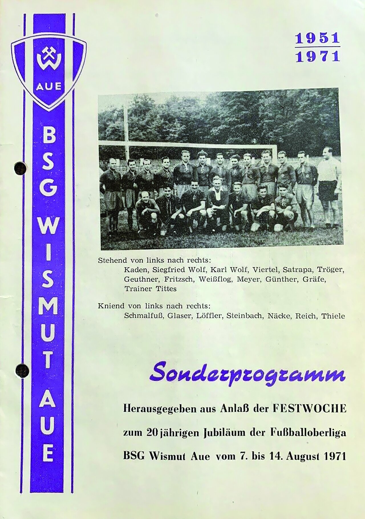 Knapp acht Wochen nach dem Ende der Saison 1970/71 feierten die Wismut-Kumpel „20 Jahre Oberliga-Fußball in Aue”. Die BSG rief ihre Freunde deshalb auf, am 7. August 1971 zum Festakt ins Kulturhaus nach Schlema zu kommen. Den Organisatoren der Jubiläumsfeier, Kurt Steinbach, Werner Lorenz und Werner Leinhos, waren freudvolle, erlebnisreiche Stunden zu danken. Verdienstvolle Akteure wurden ausgezeichnet, Spieler von Schülermannschaften überreichten Erinnerungsgeschenke. Schnell vergingen die Stunden, randvoll mit Gesprächen, Erlebnisschilderungen, Anekdoten.