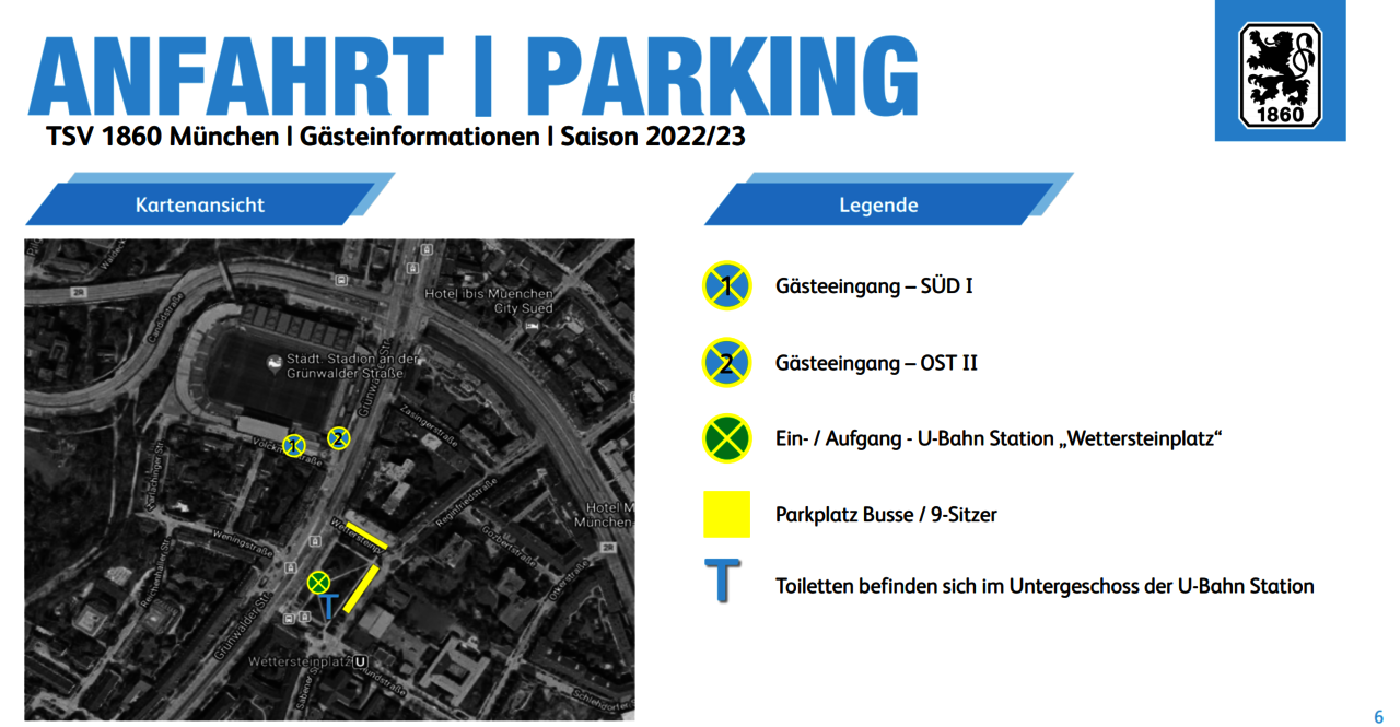 - Die Gästebusse und 9-Sitzer können in geringer Anzahl am Wettersteinplatz parken. Von dort gelangen die Gästefans zu den Eingängen SÜD I und OST II. Sollte es zu einer Überfüllung kommen, bitten wir die 9-Sitzer ebenfalls auf das Park & Ride Parkhaus am Mangfallplatz auszuweichen (Höhenbegrenzung: 2,10m).