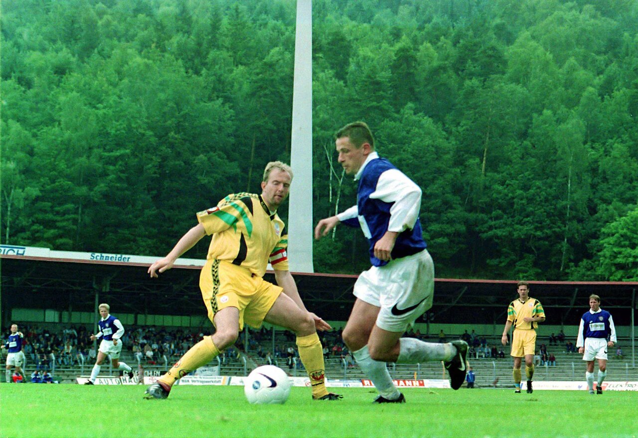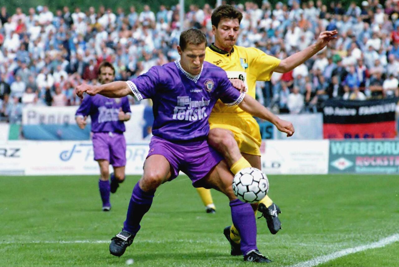 Udo Fankhänel im Zweikampf mit Rostocks Heiko März (19.07.1997). Foto: Frank Kruczynski