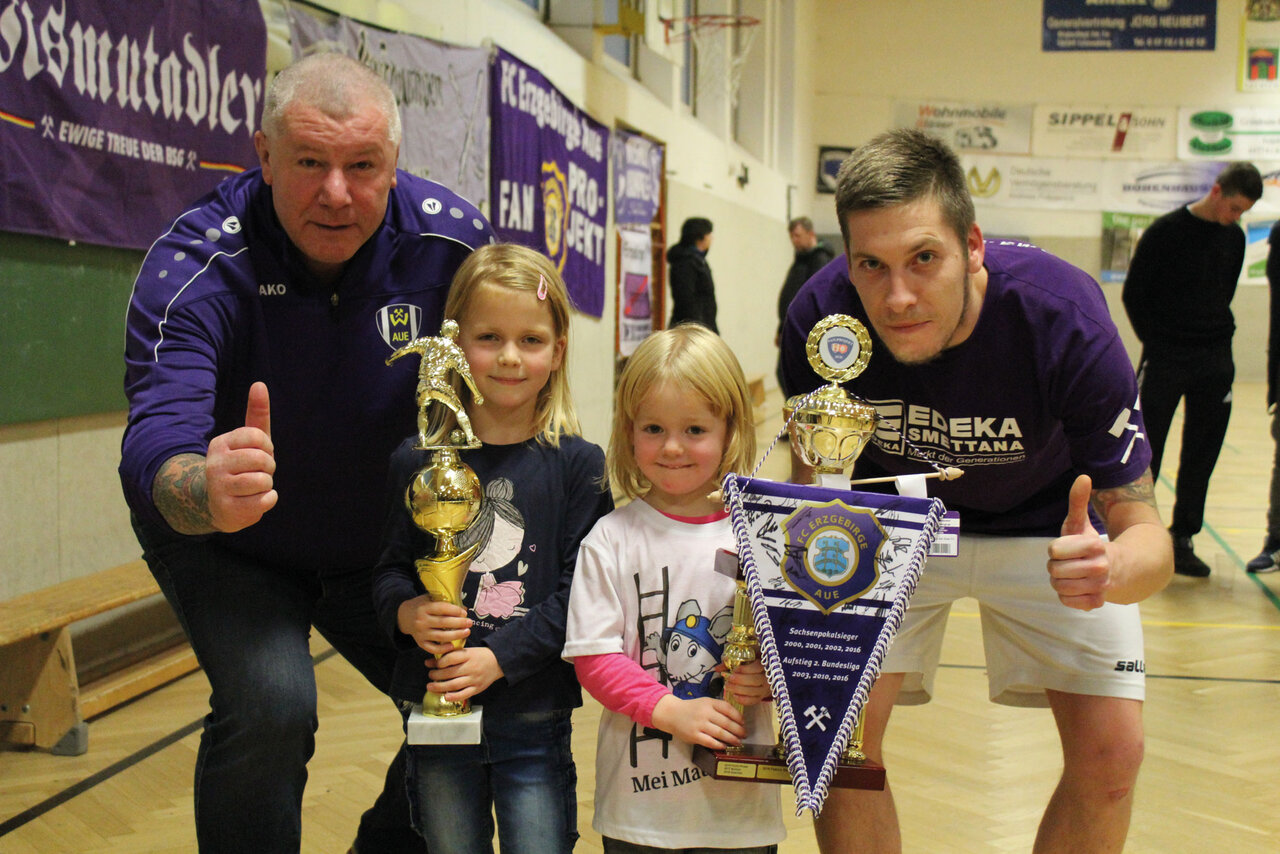 Fotos: Elf Fanmannschaften kämpften in diesem Jahr um den Siegerpokal beim Andreas-Zeise-Gedenkturnier. Über Platz eins freuten sich am Ende mit Frank „Punkt” Steinbach auch „Eisens” Töchter Marie und Anna Eisenreich sowie KKN-Spieler Kevin Heiden. Fotos: Fanprojekt Aue (2)