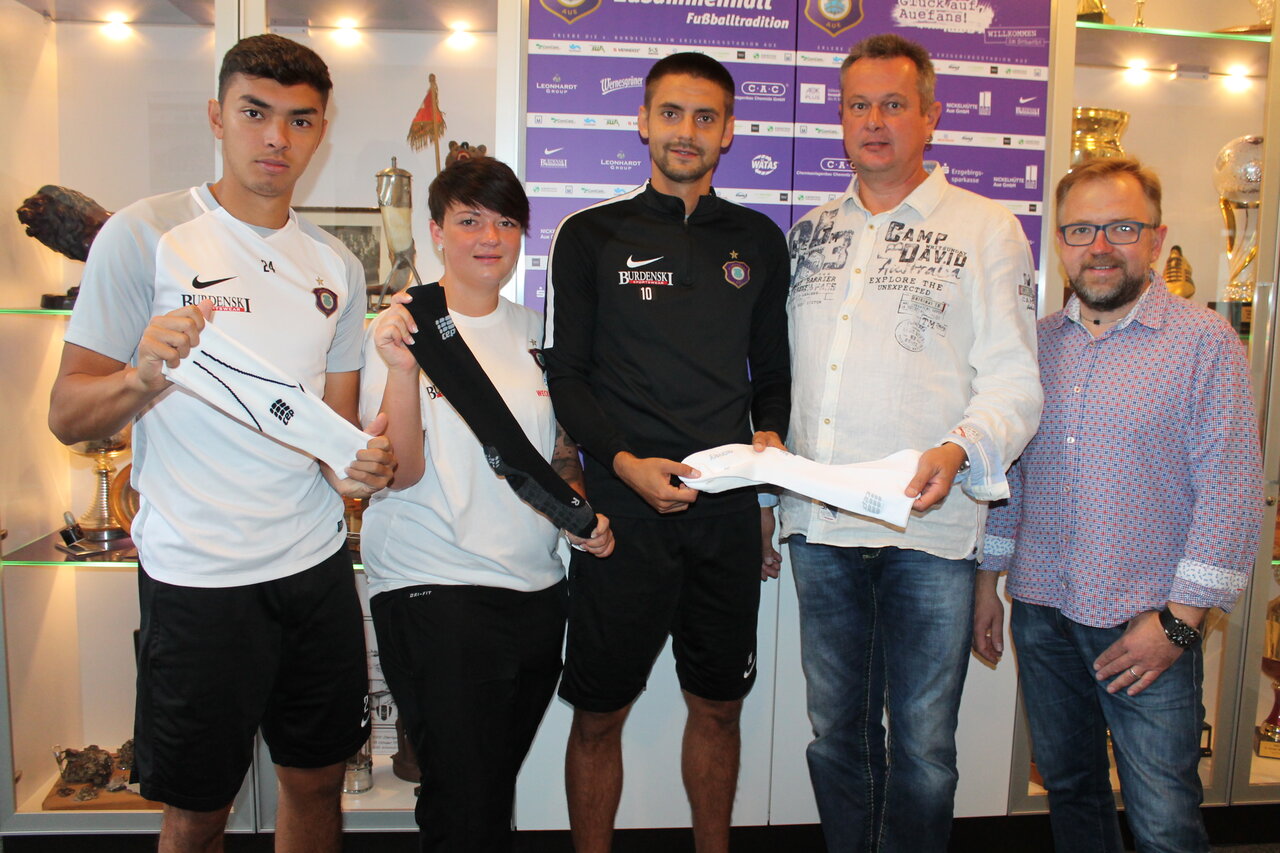 Mehr als zufrieden mit den CEP-Sportkompressionsstrümpfen von Mayer & Behnsen sind die Aue-Profis John-Patrick Strauß und Dimitrij Nazarov sowie FCE-Physiotherapeutin Marie Koch. Erst im Juli hatten die Geschäftsführer Albin Mayer (2. von rechts) und Hendrik Behnsen (rechts) den Co-Sponsorvertrag mit dem Kumpelverein um ein weiteres Jahr verlängert. Foto: Olaf Seifert