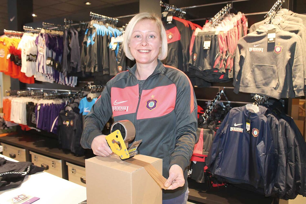 Es gibt viel zu packen in diesen Pandemiezeiten, der Onlinehandel mit lila-weißen Fanartikeln brummt. Mandy Graßer und ihren Kolleginnen vom FCE-FanShop gefällt’s. Foto: Olaf Seifert