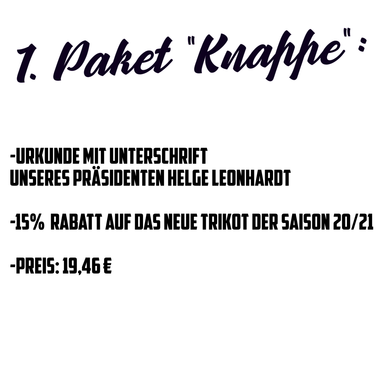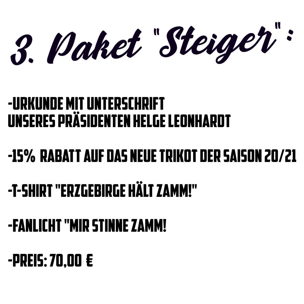 Wir denken in dieser schweren Zeit aber nicht nur an unseren Verein! Bei positiver Resonanz möchten wir einen Teil des Erlöses auch an andere in Not geratene Menschen, Institutionen oder auch Vereine weiterleiten. Die jeweilige Zusammensetzung und den vorgesehenen Spendenbetrag entnehmt ihr bitte der Grafik. Zudem ist es möglich, die einzelnen Komponenten unserer Pakete (T-Shirt, Urkunde & Osterlicht) im FanShop einzeln zu erwerben.