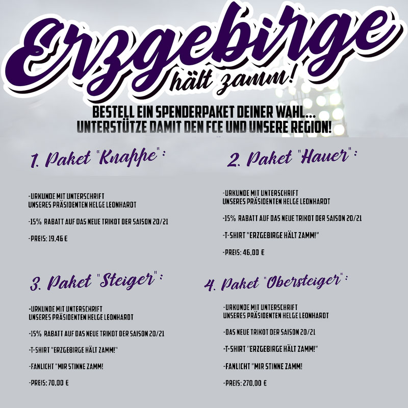 Wie sich jeder vorstellen kann, hinterlässt die Corona-Krise und die sehr höchstwahrscheinlich kommenden Spiele ohne Zuschauer ein erhebliches Loch in den Kassen unseres Kumpelvereins. Um das wenigstens etwas zu kompensieren, haben wir uns zusammen mit der Erzbrigade eine Aktion überlegt. Bei dieser kann jeder helfen einen kleinen Teil beitragen, natürlich ganz nach seinen eigenen finanziellen Mitteln und Möglichkeiten. Den Anfang macht ein 4-teiliges Hilfspaket. Begonnen beim 'Knappe' bis hin zum 'Obersteiger', könnt ihr uns im Rahmen eurer Möglichkeiten helfen.