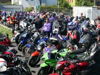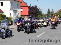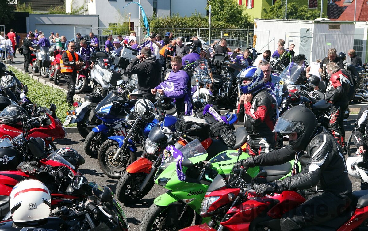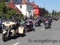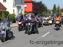 Nach kurzer Einweisung durch Michael Rüdiger machten sich über 50 Veilchen-Biker und das Begleitteam auf den Weg nach Fürth. Alle 60 Kilometer wurde ein kurzer Stop zur Rast mit Verpflegung, die von den Firmen Getränke Pausch, Leuthäuser Fleischer, Bäckerei Schellenberger und Bauer Fleischer gestellt wurde, eingelegt. Weitere Biker schlossen sich unterwegs dem Konvoi an, so dass mit über 60 Motorrädern der letzte Stopp kurz vor Fürth angefahren wurde. Nach letzten Instruktionen von Michael Rüdiger und einer kurzen Ansprache von FCE-Präsident Helge Leonhardt ging es weiter zum Sportpark Ronhof – Ergebnis bekannt. Nach dem Spiel traten dann die Veilchen-Biker einzeln die Rückreise an. Für alle Teilnehmer war es trotz unglücklichem Ergebnis ein eindrucksvoller Tag als Biker und FCE-Fan! Dank auch an die 4 Profi-Blocker in den orangfarbenen Westen, die zur Sicherheit der Tour beigetragen haben. Uwe Stübner