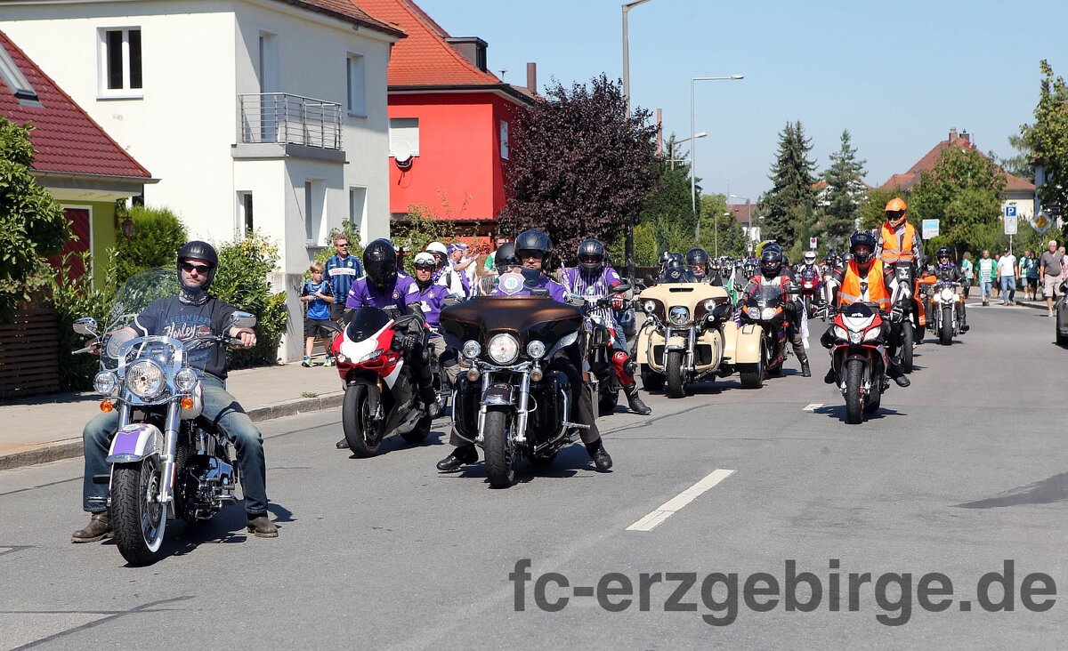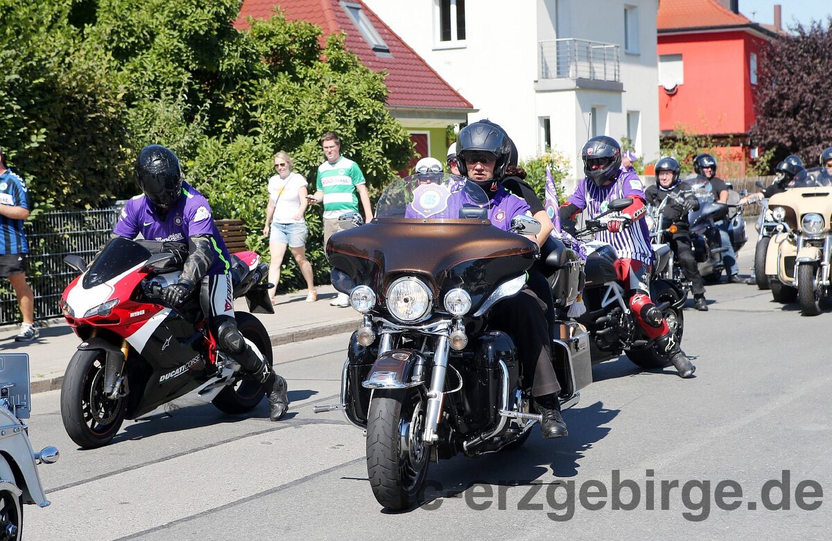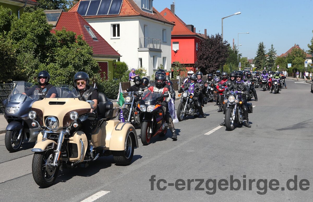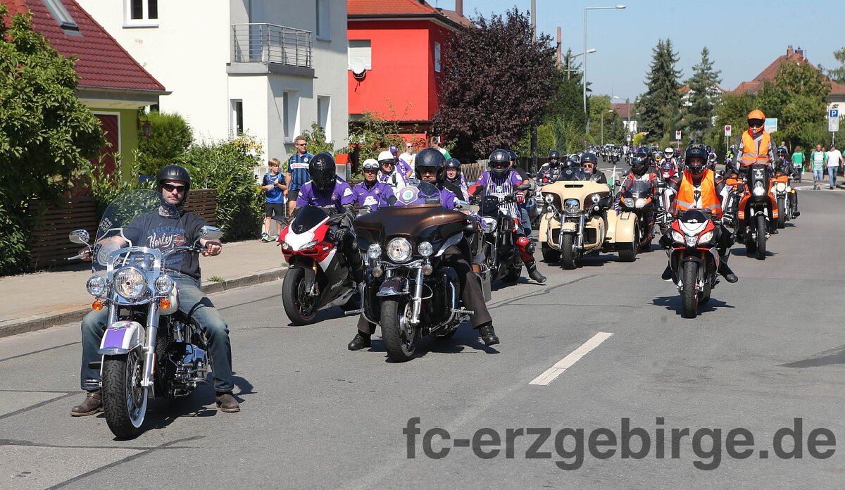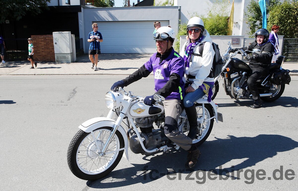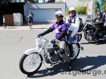 Sonnabend, 27. August 2016, früh 7.00 Uhr – Platz vor der Auer Geschäftsstelle. Organisatoren, Begleiterteams, Medienvertreter, Versorger und die Veilchen-Biker stehen pünktlich bereit. Bei der Einfahrt einer weißen 250'iger Simson AWO (ca. 12 PS, geschätztes Baujahr 1955) gab es kurz Bedenken bei Mitorganisator Uwe Stübner. „Die werden uns unseren Zeitplan richtig durcheinander bringen“ meinte er, doch Familie Weiß aus Bockau hielt mit Ihrem Oldtimer ordentlich mit.