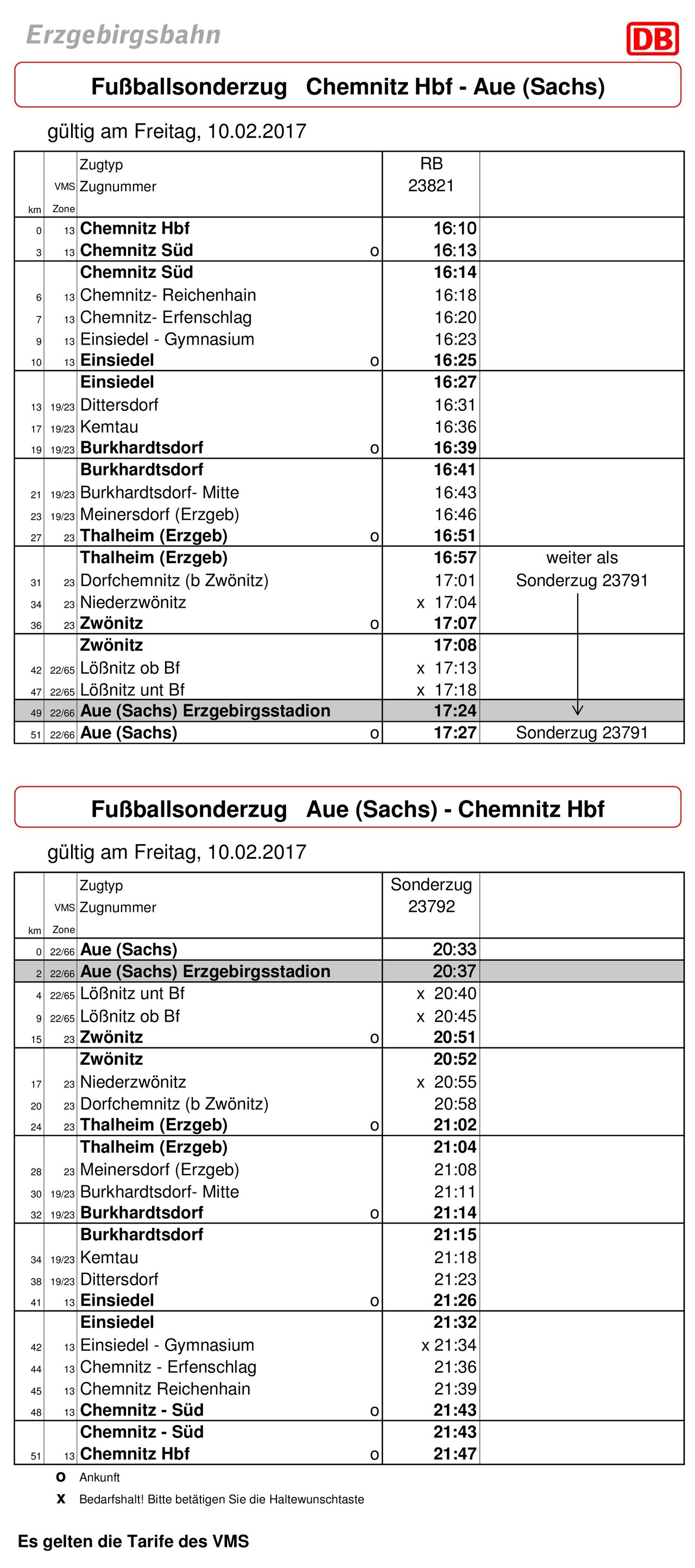 RB 23821 Chemnitz - Thalheim (Erzgeb) wird als Sonderzug verlängert; Chemnitz Hbf ab 16:10 Uhr, Thalheim (Erzgeb) an 16:51 Uhr - bis Aue (Sachs) / Ankunft Erzgebirgsstadion 17:21 Uhr