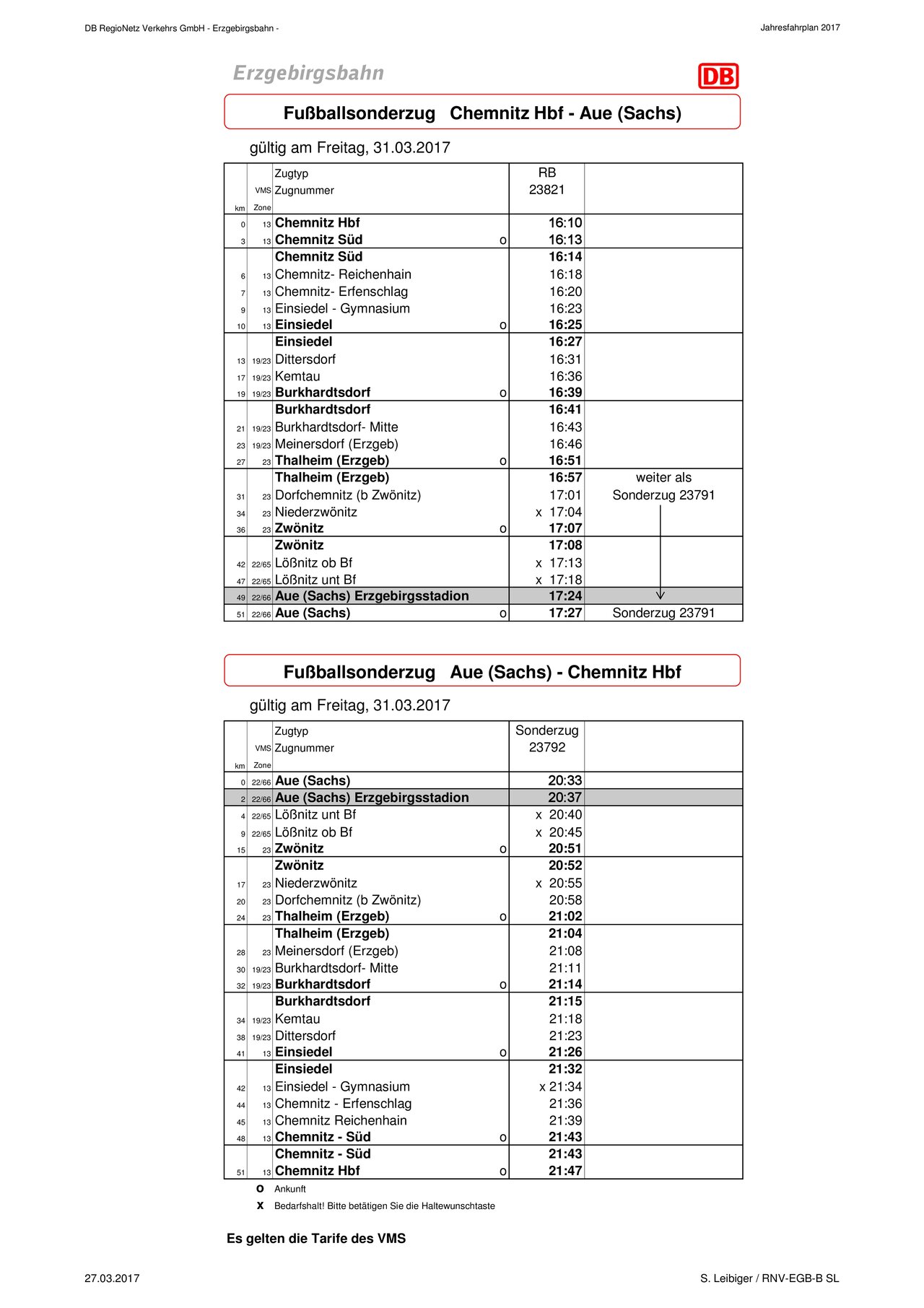 Anlässlich des Punktspiels FC Erzgebirge Aue gegen den FC St. Pauli am Freitag, 31.03.2017 erbringt die Erzgebirgsbahn wieder Sonderleistungen als "Service für Veilchenfans".