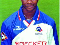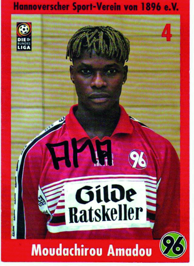 Denn von Klein auf hat ihm Moudachirou Amadou über seine unvergessliche Zeit bei den Lila-Weißen erzählt, mit denen er die Qualifikation für die damals neue Regionalliga Nordost schaffte. Zusammen mit Mittelfeldspieler Francis Makaya, der aus Kongo (Brazzaville) stammt, war er der erste Afrikaner in unserem Verein. „In meiner Zeit bestritt ich fast alle Pflichtspiele für Aue. Ich bin hier super von allen aufgenommen worden, nicht nur auf dem Platz habe ich mich mit ,Flocke’ Weißflog, Mirko Reichel, Volker Schmidt, Mirko Ullmann und den anderen prima verstanden. Ich war jung, kam aus dem fernen Benin und in Deutschland war alles neu. Umso wichtiger, dass Lutz Lindemann wie ein Vater für Francis und mich war. Die Leute in der Geschäftsstelle waren unsere Familie”, denkt Amadou gern zurück. An seinen ersten Tag im Lößnitztal erinnert er sich genau: „Jemand brachte mich mit dem Auto aus Düsseldorf nach Aue, da lief gerade ein Testspiel gegen den VfL Wolfsburg. Eben angekommen, hab ich mir Schuhe und Trikot drüber gezogen und mitgespielt. Zehn Minuten vorm Abpfiff lag ich; ein Krampf. Aber ich muss doch überzeugt haben, denn es folgten vier tolle Jahre in Aue.” Geboren am 11. Dezember 1971 in Cotonou, der größten Stadt der westafrikanischen Republik Benin, lernte Amadou das Fußball-ABC auf der Straße, ehe er bei einem Armeeverein regelmäßig trainierte und mit 16/17 Jahren in der 2. Liga spielte. Offenbar gut, denn bald wurde das Talent zu Association Sportive Dragons Football Club de l’Ouémé in die Hauptstadt Porto Novo delegiert, dem Spitzenklub des kleinen Landes. Mit der Juniorenauswahl, später auch dem Nationalteam Benins vertrat der Abwehrspieler seine Heimat im Ausland. Acht Jahre lang war Moudachirou Amadou Kapitän der Nationalelf. Höhepunkt: der Afrika-Cup 2004 in Tunesien. Da hatte sich Amadou freilich längst auch im deutschen Profifußball einen Namen gemacht. Anfang der 1990er Jahre ging er, wie viele ehrgeizige Kicker aus dem frankophonen Westafrika, nach Frankreich, wo er zwei Saisons beim FC Rochefort spielte. Dann, 1993, folgten die vier Jahre in Aue.