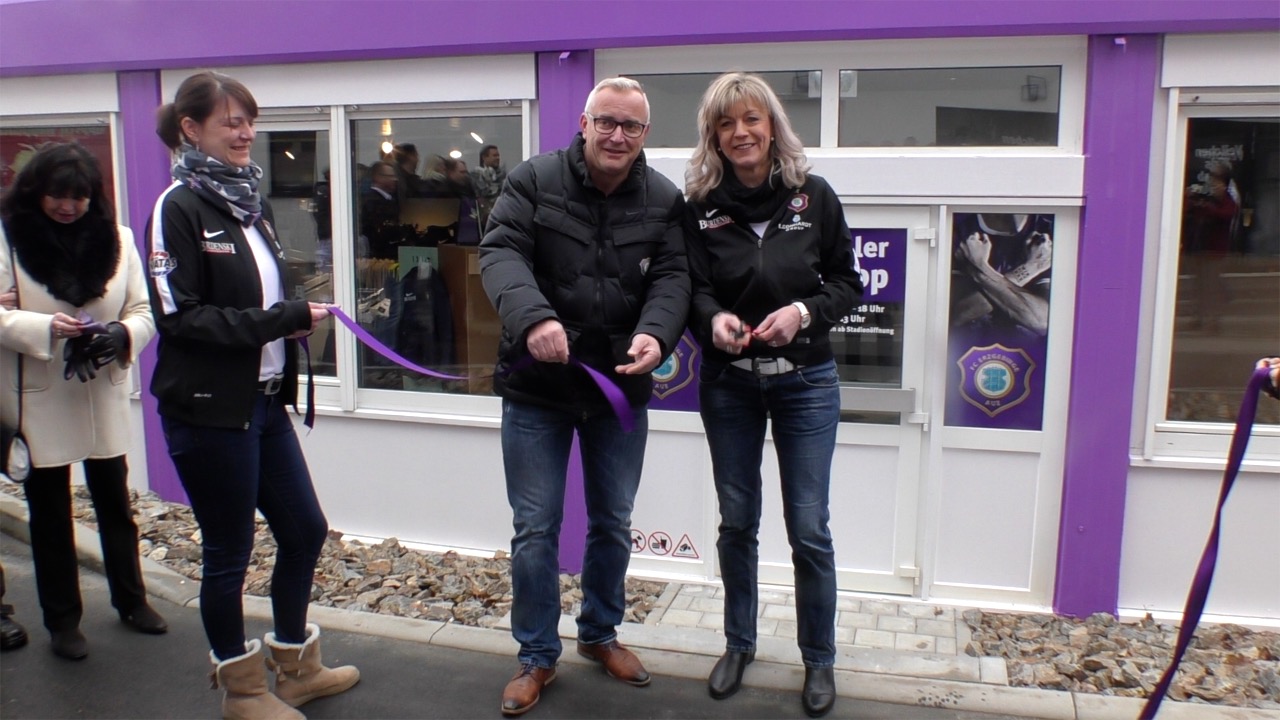 Pünktlich 12:00 Uhr wurde heute der neue Veilchen-Fanshop hinter der Haupttribüne eröffnet. Nach einleitenden Worten von FCE-Geschäftsführer Michael Voigt vor den beteiligten Handwerkerfirmen und Gästen, wurde das Eröffnungsband symbolisch zerschnitten. Im Anschluß führte Verkaufsleiterin Simone Adler die geladenen Gäste durch die neue 300qm große Verkaufsfläche.