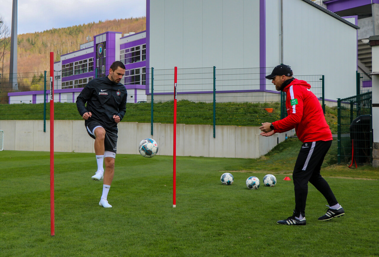 Bei seinem Einzeltraining konnte Paco auch ein Auge auf das 'Mannschaftstraining' werfen: "Im Prinzip haben wir ja alle Einzeltraining." lacht Paco. "Ich glaube, wir machen das Beste daraus. Von außen betrachtet, war es ein sehr interessantes Training, die vielen Tempoläufe und Abschlüsse haben die Jungs wahrscheinlich total geschlaucht. Was ich dabei extrem fand, die Qualität war heute hoch, von den 20-Meter-Schüssen war ja einer nach dem anderen drin." staunt Pascal. "Ich glaube schon, dass man sich da weiterentwickeln kann. Trotzdem fehlt aber was. Beim Fußball will man sich in Zweikämpfen messen, man will aufs Tor schießen und darum können wir hoffentlich bald wieder zur Normalität zurückkehren."