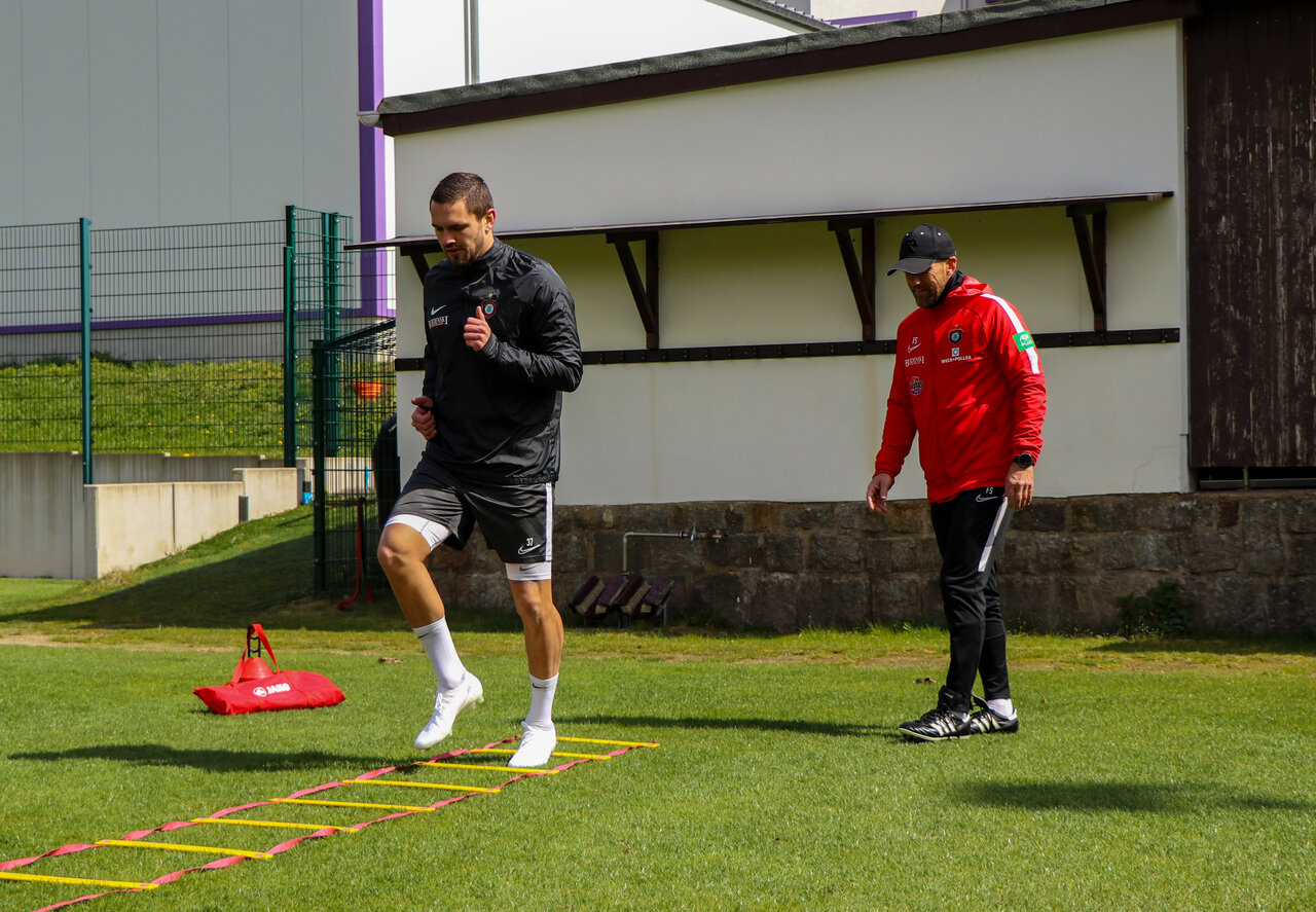 Veilchen-Stürmer Pascal Testroet hat gestern nach seiner Knieoperation erstmals wieder im Erzgebirge trainiert. Paco hatte die letzten zwei Wochen eine Reha-Klinik in Donaustauf besucht. "Ich habe dort angefangen auf einem Alter-G zu trainieren. Das ist ein Laufband auf dem das Körpergewicht bis fast zur Schwerelosigkeit reduziert werden kann. Hinzu kamen Koordinations- und Kräftigungsübungen. Das Programm haben wir täglich gesteigert, bis zur Maximalleistung, so dass ich heute wieder auf den Platz zurückkehren konnte.", erklärte Pascal Testroet nach dem Training.