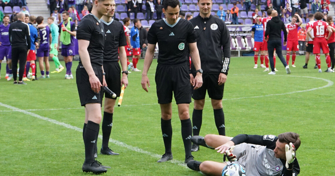 Die Szene war skurril. Kapitän Martin Männel machte nach Abpfiff des Heimspiels gegen Bielefeld Überstunden und warf sich vor dem Schiedsrichter-Quartett auf den Rasen.