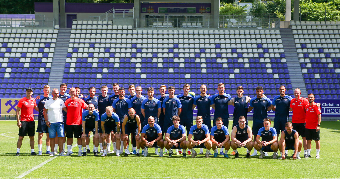 Die Veilchen sind am Sonntagnachmittag bei 38 Grad im Erzgebirgsstadion in die neue Saison gestartet. Als erstes wurde das neue Trainerteam den 800 anwesenden Fans vorgestellt. Foto: Unser ...